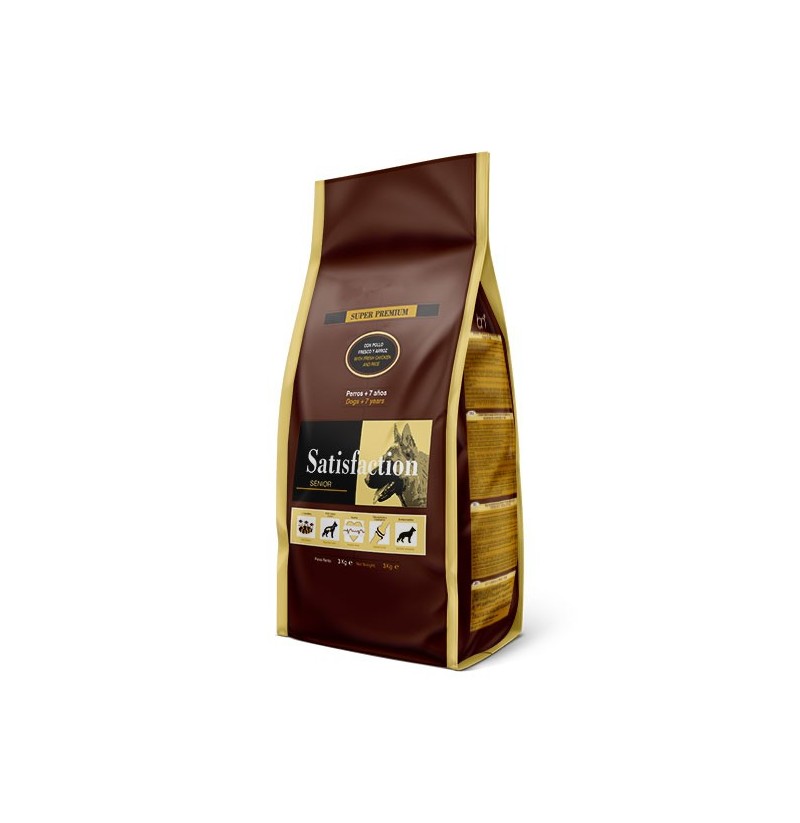 Satisfaction Senior es un pienso sabor a pollo y arroz adaptado a las necesidades nutricionales de los perros en su etapa senior, en la cual se disminuyen los niveles de actividad y se presentan cambios en su metabolismo.