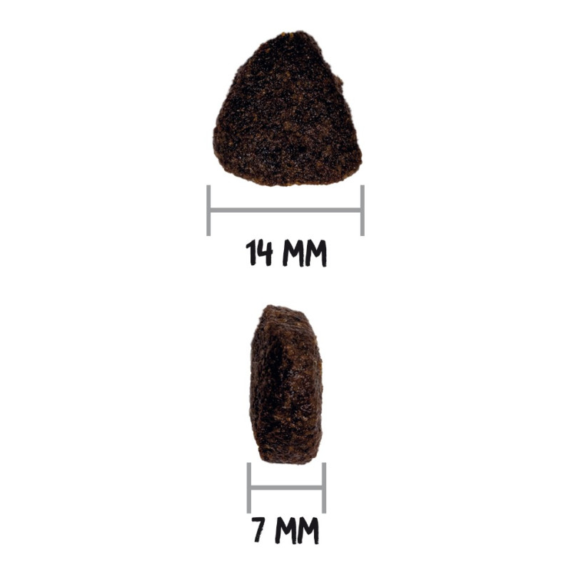 Proteína: 38%, contenido en grasa: 18%, fibras brutas: 3%, materia inorgánica: 9%, humedad: 8%, Omega 6: 2%, Omega 3: 0,6%, calcio: 1,5%, fósforo: 1%.