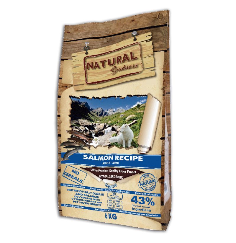 Receta hipoalergénica de salmón de grado humano, formulada sin cereales (Grain Free) o granos con un tamaño de croqueta especialmente diseñado para satisfacer las necesidades de los perros de raza pequeña o mini. Alimento completo desarrollado idealmente para perros adultos con digestión sensible o para perros que simplemente requieren una alimentación de alta calidad.