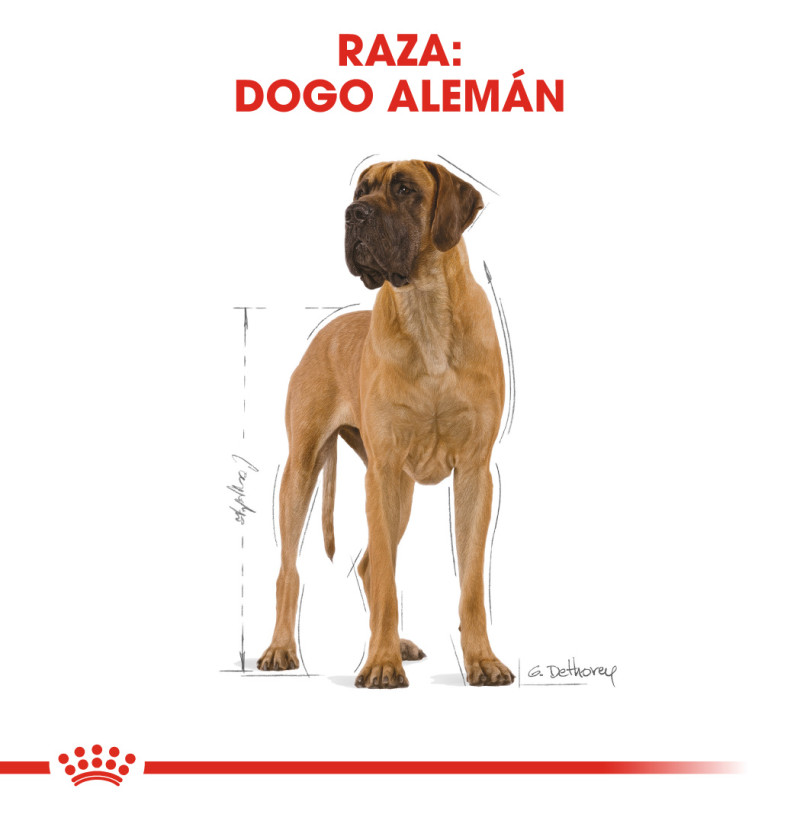 Popularmente reconocida como la raza de perros de mayor tamaño del mundo, los ejemplares de Gran Danés combinan orgullo y poder ¡en grandes proporciones! Great Dane Adult de Royal Canin es un alimento apto perros a partir de 24 meses y ha sido especialmente formulado teniendo en cuenta las necesidades nutricionales de tu Gran Danés adulto. Contribuye al mantenimiento de su salud digestiva. Esto es posible gracias a la inclusión de proteínas altamente digestibles (L.I.P.) y a la selección de fibras específicas que limitan la fermentación intestinal y favorecen el equilibrio de la flora intestinal. Con su imponente estatura y un período de crecimiento muy largo, el Gran Danés exige mucho a sus articulaciones. Contiene una cantidad adaptada de calcio, fósforo y otros nutrientes específicos (como EPA y DHA) para mantener los huesos y las articulaciones saludables. Además, con un cuerpo habitualmente constituido por un 80 % de masa muscular, el Gran Danés tiene necesidades energéticas, que por lo general son un 50 % más altas que las de otros perros de su clase. Por eso cuenta con un contenido de energía adaptado, para cubrir las altas necesidades energéticas del gran danés, sin sobrecargar su estómago.