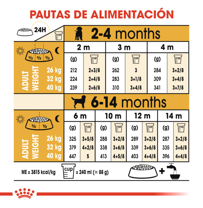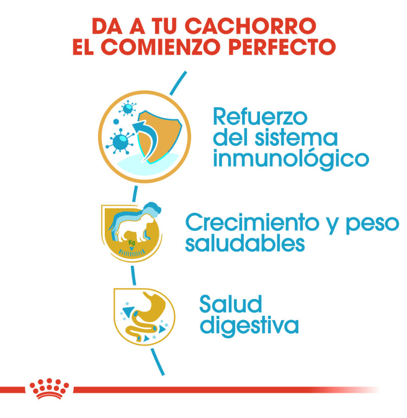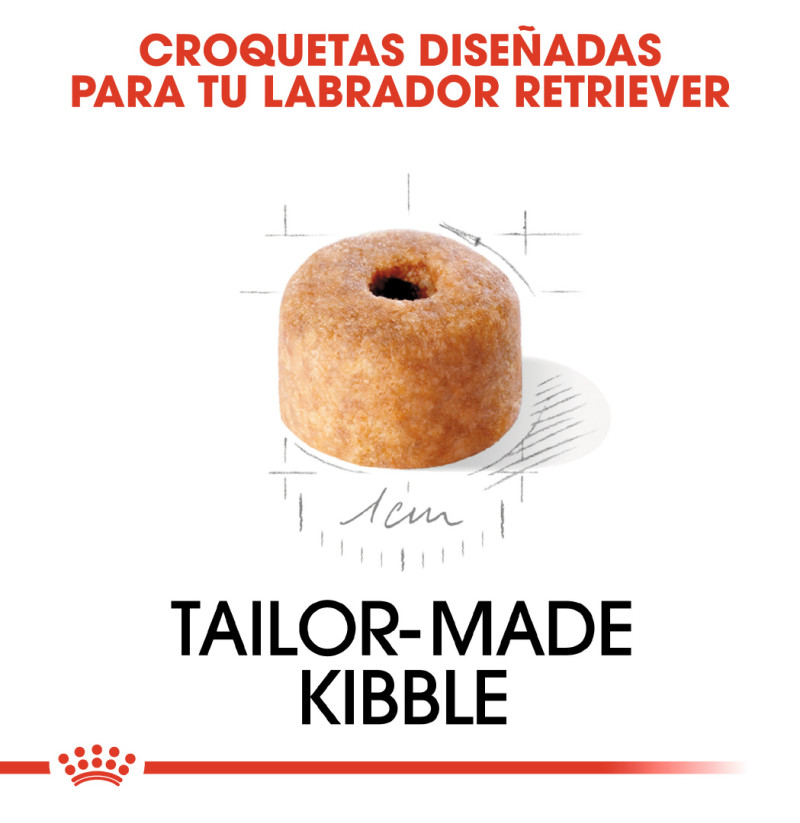 Labrador Retriever Puppy de Royal Canin es un alimento indicado para labradores retrievers de hasta 15 meses de edad y ha sido específicamente formulado teniendo en cuenta las necesidades nutricionales de perros jóvenes de esta raza. El sistema inmunológico de tu perro se está desarrollando, por eso aporta un complejo exclusivo de antioxidantes (que incluye vitamina E) para reforzar sus defensas naturales durante este período clave de crecimiento. Gracias a un contenido de energía, proteína, calcio y fósforo específicamente adaptado. A demás, contribuye al correcto desarrollo de la estructura ósea de tu cachorro en crecimiento. También favorece un aumento de peso armonioso, ayudando así a que tu cachorro mantenga un peso ideal mientras crece. También aporta una combinación de nutrientes con proteínas de alta calidad (L.I.P.*) y prebióticos (FOS) para favorecer la salud digestiva y el equilibrio de la flora intestinal, contribuyendo también a la buena calidad de las heces La croqueta está específicamente diseñada y específicamente adaptada para los cachorros de esta raza. Su tamaño facilita a tu cachorro la prensión y la masticación, y su textura mejora su palatabilidad general.