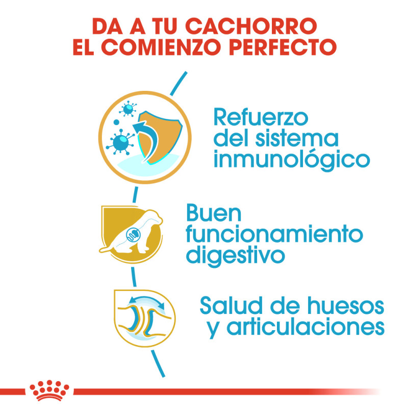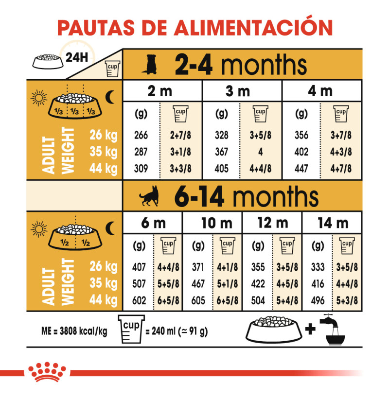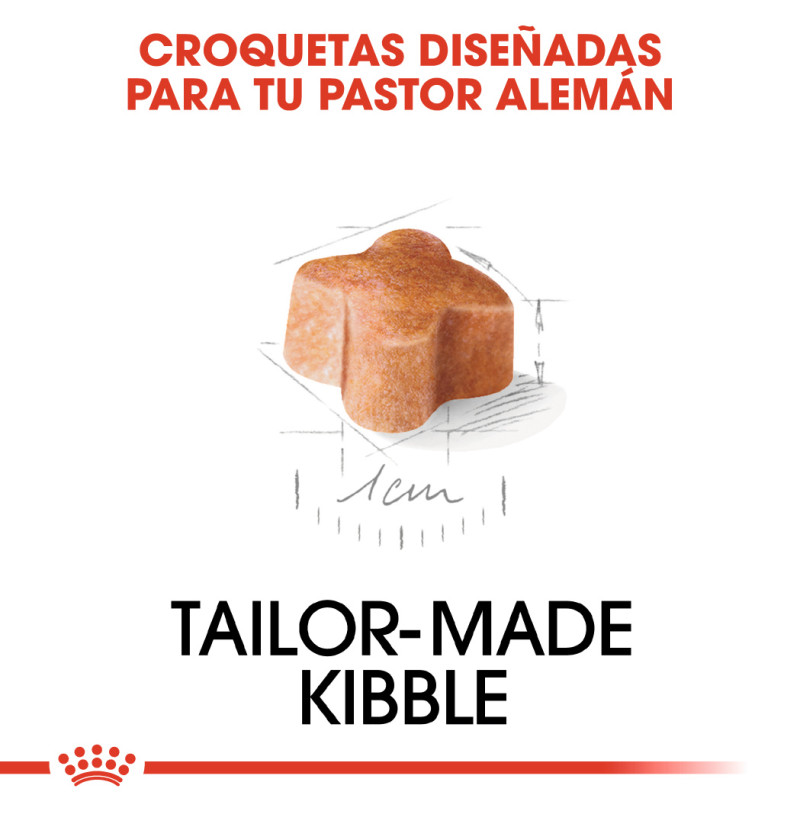 Royal Canin Pastor Alemán Junior es un alimento adecuado para cachorros de raza Pastor Alemán de hasta 15 meses de edad y ha sido especialmente formulado teniendo en cuenta las necesidades nutricionales de los perros jóvenes de esta raza. El crecimiento es una fase muy importante de la vida del perro: es una época de grandes cambios, descubrimientos y nuevos encuentros. Durante este período clave, el sistema inmunológico del cachorro se desarrolla de forma gradual. Ayuda a reforzar las defensas naturales del cachorro gracias a un complejo patentado de antioxidantes que incluye vitamina E. Contiene una combinación adaptada de nutrientes que favorecen el mantenimiento de una salud digestiva óptima. Esto incluye proteínas específicamente seleccionadas por su muy elevada digestibilidad. La forma y el tamaño de la croqueta están específicamente diseñados para que sea altamente palatable, así como para adaptarse de forma específica a la mandíbula de los cachorros de Pastor Alemán. Gracias a un contenido adaptado de calcio y de fósforo, ayuda a mantener fuertes y saludables los huesos y articulaciones. Además, esta fórmula exclusiva también le ayuda a mantener su peso ideal.
