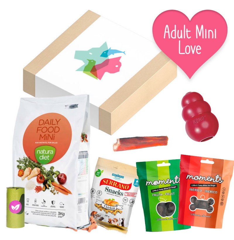 La Caja Love Mini para perros adultos de raza pequeña, contiene 7 artículos. Uno de ellos es el alimento de primera calidad Natura Diet Daily Food MINI de pollo y arroz en formato de 3kg y croqueta pequeña con ingredientes de proximidad para cuidar la salud y llenar las barriguitas a los peluditos de la mejor forma con alimentación natural. Snacks variados para darles pequeños grandes mimos y cuidarles la salud dental. También lleva incluido un Rollo de bolsitas con aroma Lavanda para sus necesidades.
