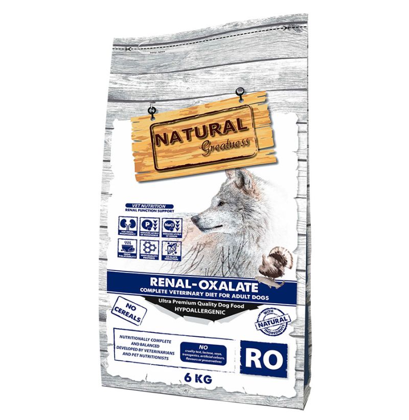 Natural Greatness renal-oxalate es un pienso destinado a perros adultos de todas las razas que padecen insuficiencia renal crónica. Combate y evita la reaparición de cálculos de oxalato. Alimento hipoalergénico completo y grain free elaborado con ingredientes naturales. Contiene prebióticos FOS y MOS que favorecen la correcta función de la flora intestinal.