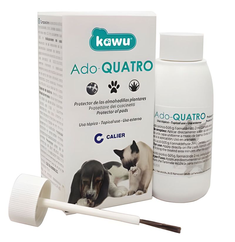 Ado Quatro S es el protector de almohadillas para la prevención de las irritaciones en las almohadillas de los perros y gatos. Si tu mascota tiene mayor sensibilidad, temporadas de mayor actividad o las condiciones del medio que hacen que pueda tener mayor irritación de las almohadillas, este producto es el adecuado, ya que aumenta la resistencia al roce porque esta formulada con extract de centella asiática que su propiedad principal es su gran poder de cicatrización ya que estimula la producción de colágeno que es una de las proteínas fundamentales en la curación de las heridas.