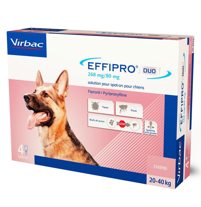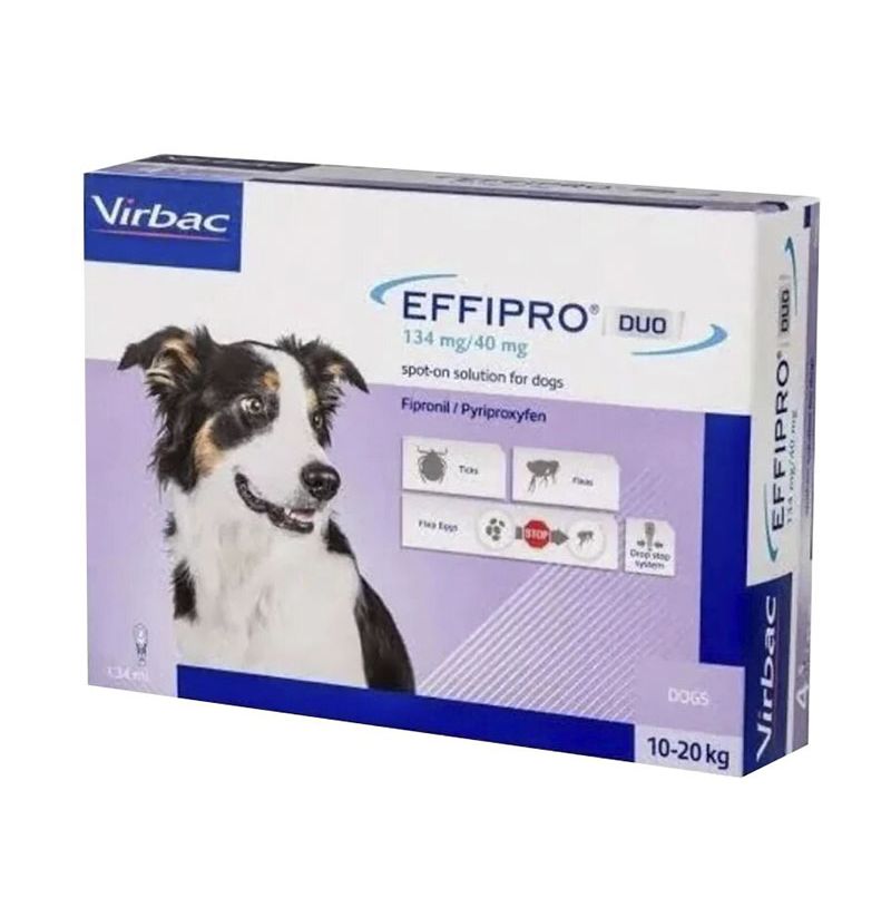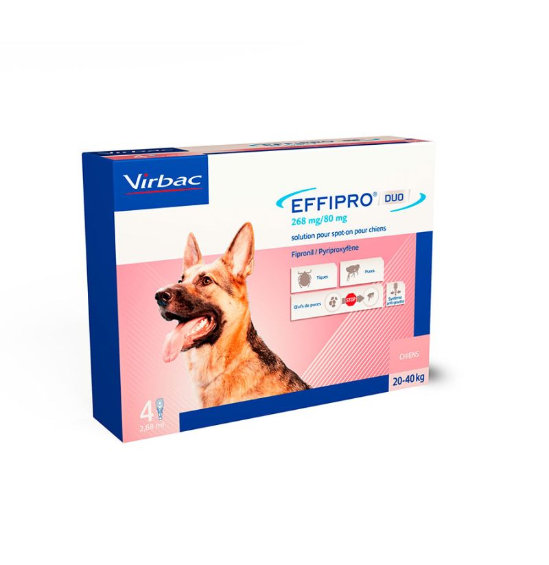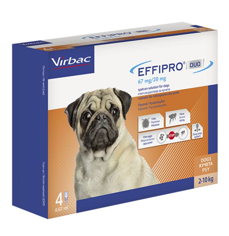 Effipro DUO es un antiparasitario externo para perros en pipetas spot on, fáciles de usar, que contiene fipronilo y piriproxifeno que es una combinación única de principios activos para una protección óptima frente a garrapatas, pulgas y huevos de pulgas.