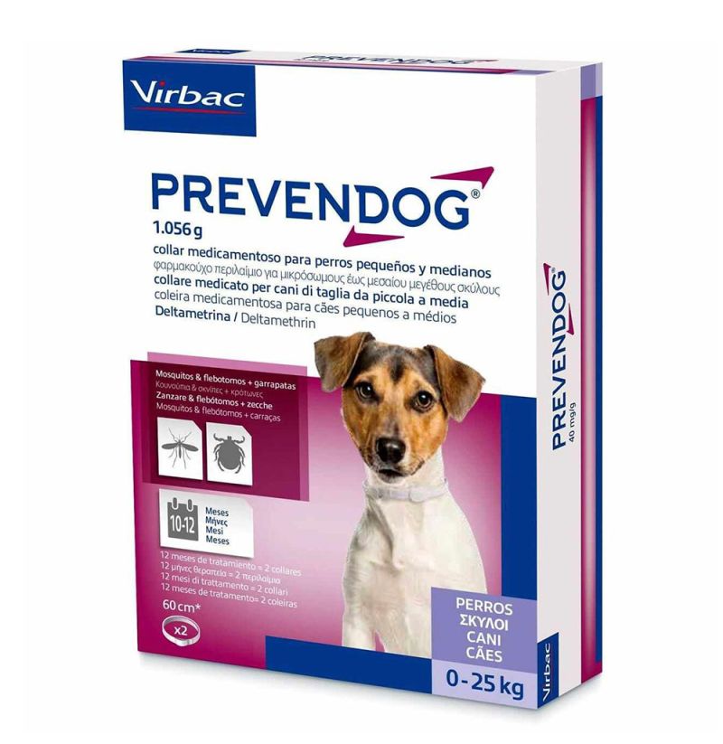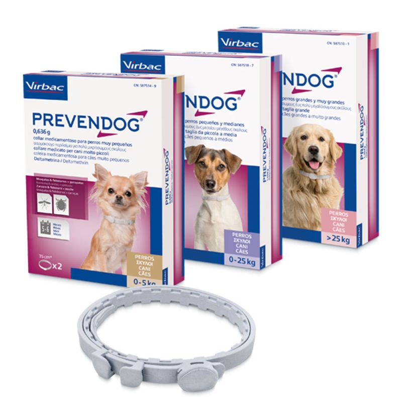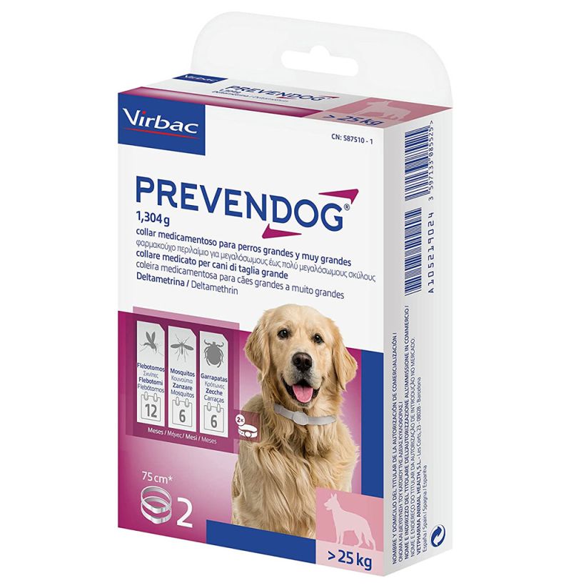 El collar Prevendog es antiparasitario para perros eficaz en la protección frente a garrapatas, mosquitos y flebotomos. Tiene una duración de 12 meses en flebotomo y 6 meses en garrapatas y mosquitos. Este collar contiene Deltametrina para mantener alejados a los insectos e impedir la infestación. Su tecnología avanzada permite una liberación lenta y continua por todo el cuerpo para conseguir una protección eficaz y más duradera.