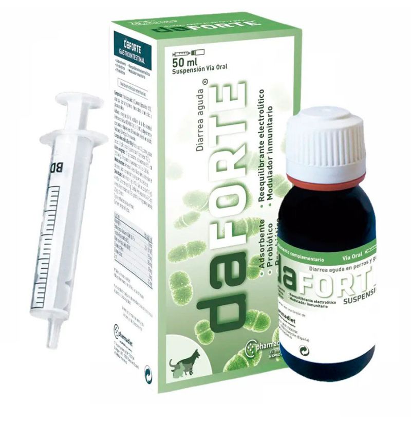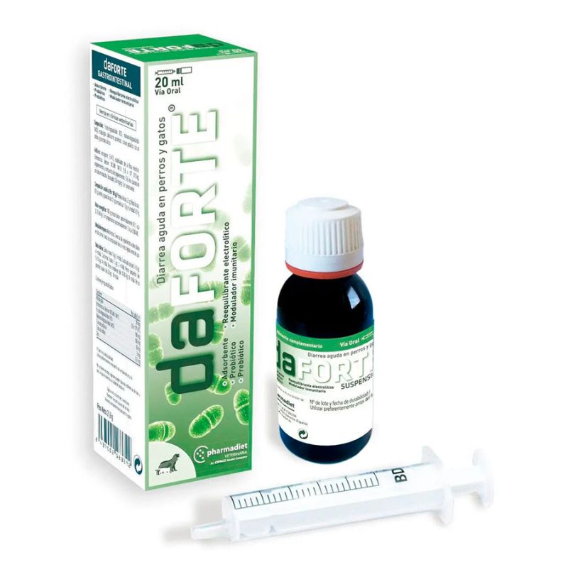 https://tienda.todomascota.es/perros/23334-daforte-antidiarreico-para-perros-y-gatos-8414042003936.html#/cantidad-20_mlMVT01158Daforte Plus AntiDiarrea Suspensión para perros y gatos<h2>Daforte Plus: gel antidiarreico natural para perros y gatos que ayuda a restablecer la flora intestinal</h2> <p>Daforte Plus es un alimento complementario en formato gel, diseñado especialmente para perros y gatos (y recomendado también para otros animales de compañía como reptiles, hurones o roedores en ciertos casos). Contiene una combinación de sílice absorbente (atapulgita) y probióticos/inactivados, junto con minerales clave, para ayudar a cortar episodios de diarrea, normalizar el tránsito intestinal y favorecer la recuperación del sistema digestivo.</p> <p><strong>Beneficios clave:</strong></p> <ul> <li>Ayuda a reducir la frecuencia y duración de la diarrea.</li> <li>Contribuye a restablecer la flora intestinal gracias a la presencia de probióticos y microorganismos inactivados.</li> <li>Contiene atapulgita: mineral adsorbente que ayuda a absorber fluidos y toxinas en el intestino.</li> <li>Incluye minerales como potasio, sodio y zinc para ayudar a prevenir la deshidratación asociada a diarreas.</li> <li>Formato líquido con jeringa dosificadora, para facilitar la administración.</li> </ul> <h3 style="margin-top: 15px;"><strong>Composición (ingredientes y aditivos):</strong></h3> <ul> <li><strong>Ingredientes:</strong> Glicerina (vegetal), atapulgita, Limosilactobacillus reuteri (inactivado), Lacticaseibacillus rhamnosus (inactivado), cloruro potásico, cloruro sódico.</li> <li><strong>Aditivos por mL:</strong> oligoelementos: 0,35 mg de cinc (sulfato de cinc monohidratado); estabilizador de la flora intestinal: 2,50×10⁸ UFC de Lactobacillus acidophilus; conservantes: 6,0 mg de ácido cítrico, 7,2 mg de sorbato potásico.</li> <li><strong>Componentes analíticos:</strong> Proteína bruta: 6 %, Grasa bruta: 0,8 %, Fibra bruta: 0,2 %, Ceniza bruta: 3,7 %, Humedad: 74 %</li> <li><strong>Valor energético:</strong> 78 kcal/100 g → 1 kcal/mL</li> </ul> <h3 style="margin-top: 15px;"><strong>Modo de empleo:</strong></h3> <ul> <li>Agitar antes de usar.</li> <li>Administrar 2 veces al día, dividiendo la dosis total en dos tomas.</li> <li>Dosis orientativa según peso: hasta 5 kg: 2 mL/día; 5–10 kg: 4 mL/día; 10–20 kg: 8 mL/día; más de 20 kg: 10 mL/día.</li> <li>Continuar el tratamiento hasta que las heces se normalicen.</li> </ul> <p><strong>Por qué elegir Daforte Plus en Todomascota.es:</strong><br /> Combina ingredientes que cuidan de forma suave pero efectiva el sistema digestivo de tu mascota, sin aditivos agresivos, y ayuda a recuperar la pancita de tu compañero peludo tras un episodio de diarrea. Ideal para cambios de dieta, estrés o tratamientos con antibióticos.</p> <!-- Meta información SEO -->https://tienda.todomascota.es/55182-large_default/daforte-antidiarreico-para-perros-y-gatos.jpg14.85instockPHARMADIET14.8513.5002022-06-20T11:20:06+0200/Gatos/Perros/Perros/Alimentación para perros/Gatos/Alimentación para gatos/Perros/Alimentación para perros/Complementos alimentarios y vitamínicos para perros/Gatos/Alimentación para gatos/Complementos alimentarios y vitamínicos para gatos