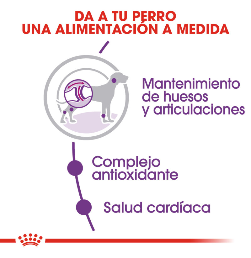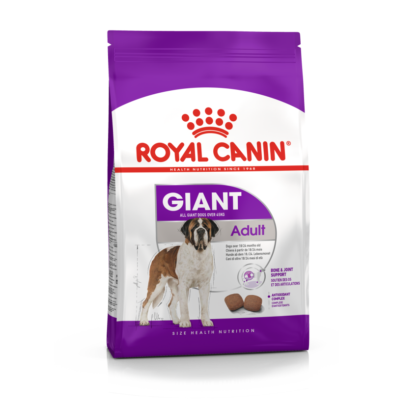 Giant Adult de Royal Canin es un alimento indicado para perros adultos de 45 kg o más y ha sido específicamente formulado teniendo en cuenta las necesidades nutricionales de perros de raza gigante como el tuyo. Debido a su tamaño y peso corporal, es importante que la alimentación de tu perro contribuya al buen mantenimiento de su salud osteoarticular. Aporta glucosamina y condroitina que ayudan al mantenimiento de huesos y articulaciones. Está formulado con una combinación exclusiva y equilibrada de antioxidantes (incluyendo las vitaminas A, E y C) que ayuda a neutralizar los efectos de los radicales libres. Esta alimentación también aporta aminoácidos, como la taurina y la L-carnitina, que favorecen su salud cardíaca