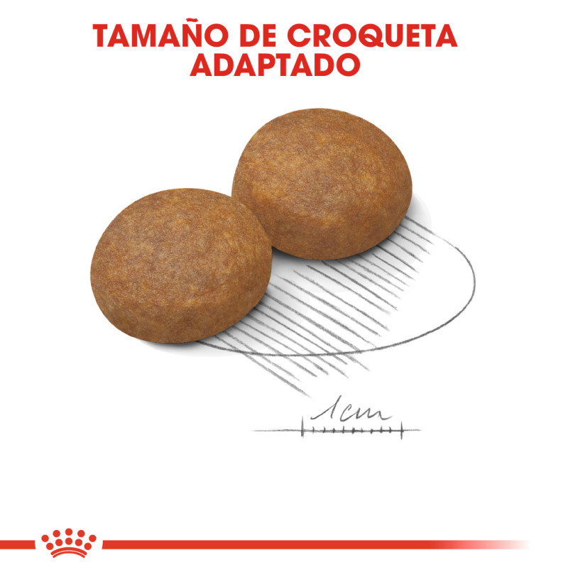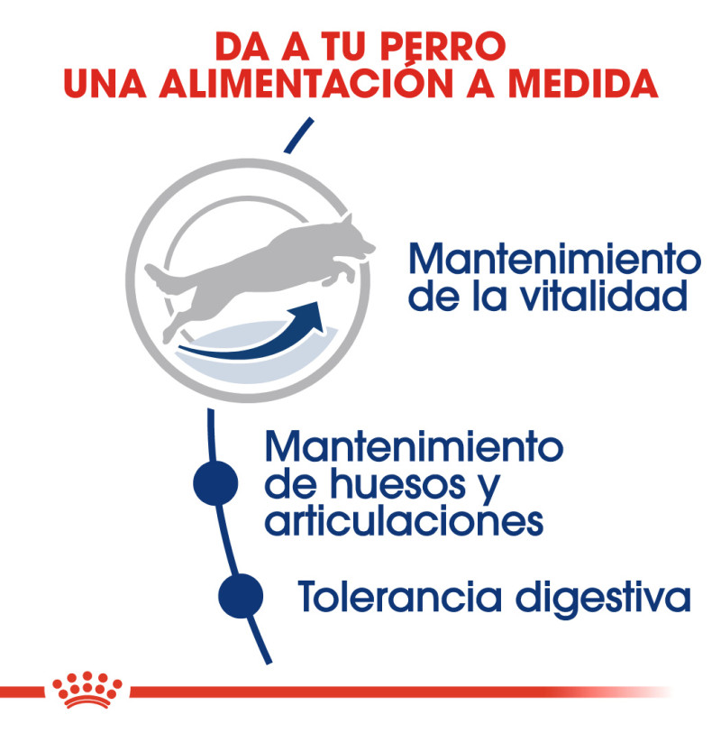 Cada perro envejece de forma distinta, pero cuando los perros de tamaño grande alcanzan, aproximadamente, la edad de 5 años, empiezan a manifestarse los primeros signos de envejecimiento. Por eso, es importante recordar que proporcionarles una dieta equilibrada para cada una de las etapas de su vida es algo crucial. El alimento para perros Maxi Adult 5+ de Royal Canin ha sido formulado teniendo en cuenta las necesidades nutricionales de los perros de mediana edad y es adecuado para perros de tamaño grande de 5 años o más, con un peso adulto de entre 26 y 44 kg. Los perros grandes de mediana edad son propensos a aumentar de peso en esta etapa de su vida, lo que hace que sea todavía más importante que lleves a cabo un control de racionamiento diario y evites que coma en exceso. Contiene una combinación única y equilibrada de fibra alimentaria y proteínas de muy alta calidad, lo que garantiza que se aporta todo lo que tu perro necesita para mantener un peso saludable y favorecer una digestión óptima. Ha sido específicamente formulado para reforzar los huesos, los ligamentos y las articulaciones de los perros de raza grande en esta etapa de su vida; para que puedan soportar bien su peso y llevar un estilo de vida activo. Aunque tu perro empiece a mostrar los primeros signos de envejecimiento, todavía está lleno de energía. Por eso, tiene un contenido adaptado de nutrientes, entre los que se incluye un complejo exclusivo de antioxidantes que favorece la neutralización de radicales libres y ayuda a que tu perro conserve su vitalidad