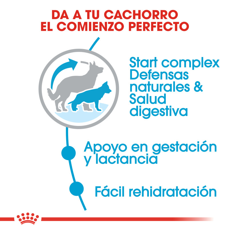 Royal Canin Maxi Starter Mother & Babydog está especialmente formulado para satisfacer las necesidades nutricionales de las madres tras el parto y de sus cachorros. Esta fórmula es adecuada para perras adultas de tamaño grande que pesan entre 26 y 44 kg y para cachorros en periodo de destete de hasta 2 meses de edad. Este alimento a medida está especialmente adaptado para satisfacer las elevadas necesidades energéticas de tu perra grande, al mismo tiempo que favorece el desarrollo saludable de tus cachorros en periodo de destete, incluso en el caso de camadas numerosas. También contiene un complejo probado que incluye vitaminas C y E para favorecer un desarrollo saludable del sistema inmunitario. Esta fórmula incluye prebióticos beneficiosos y proteínas de alta digestibilidad, que favorecen el equilibrio saludable del microbioma (flora intestinal) y la salud digestiva. Está enriquecido con un ácido graso omega-3, que contribuyen al desarrollo cerebral saludable de los cachorros corta edad. La croqueta es fácil de rehidratar con agua, consiguiendo una apetecible textura de papilla que es ideal para los cachorros en periodo de destete.