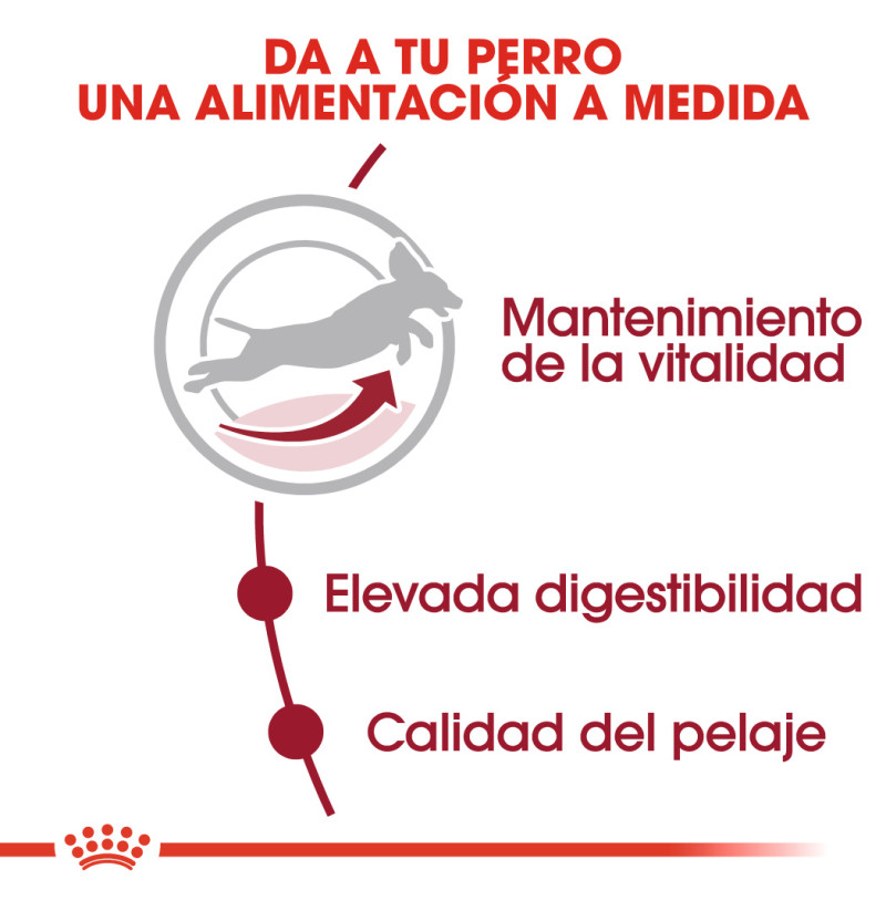 Medium Adult 7+ de Royal Canin cuenta con un contenido adaptado de nutrientes que ayuda a mantener la vitalidad de los perros de razas de tamaño mediano como el tuyo que deben hacer frente a los primeros signos del envejecimiento. Además, contiene un complejo exclusivo de antioxidantes para ayudar a neutralizar los radicales libres y mantener el buen estado de moléculas vitales, localizadas en el cuerpo de tu perro. Favorece una digestibilidad óptima, gracias a una fórmula exclusiva de nutrientes, lo que incluye un suministro equilibrado de fibra alimentaria y una cantidad óptima de proteínas de muy alta calidad. Además, está enriquecido con ácidos grasos EPA y DHA que favorecen la salud cutánea de tu perro, así como una condición óptima de su pelo.