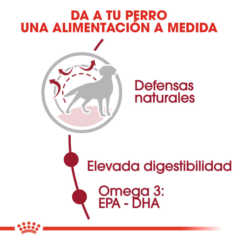 A los 12 meses, tu perro de tamaño de raza mediano ya ha finalizado su fase de crecimiento. Proporcionarle una nutrición óptima durante esta etapa de su vida es tan importante como cuando estaba creciendo. Garantizar que el alimento de tu perro le proporciona los nutrientes adecuados y en los niveles óptimos es fundamental para favorecer y mantener su buen estado de salud. Medium Adult de Royal Canin es un alimento específicamente formulado teniendo en cuenta las necesidades nutricionales de tu perro adulto de tamaño mediano y está indicado para perros de 1 a 7 años, con un peso de entre 11 y 25 kg. Contiene un complejo exclusivo de antioxidantes, y nutrientes como manano-oligosacáridos, para reforzar las defensas naturales de tu perro y el mantenimiento de un estilo de vida saludable. Gracias a una fórmula exclusiva que incluye proteínas de muy alta calidad y un aporte equilibrado de fibra alimentaria, también es muy digestible, permitiendo que tu perro obtenga los nutrientes de forma efectiva también está enriquecido con ácidos grasos omega 3, como EPA y DHA, que ayudan a mantener la salud de la piel y el pelo.