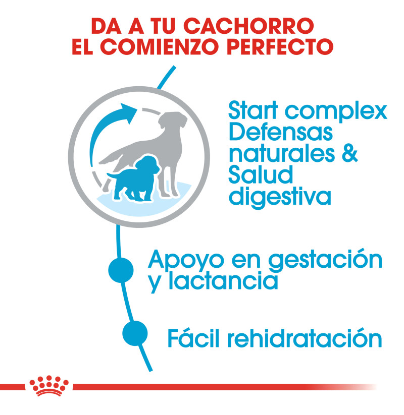 Royal Canin Medium Starter Mother & Babydog está especialmente formulado para satisfacer las necesidades nutricionales de las madres tras el parto y de sus cachorros. Esta fórmula es adecuada para perras adultas de tamaño mediano que pesan entre 11 y 25 kg y para cachorros en periodo de destete de hasta los 2 meses de edad. Este alimento a medida está especialmente adaptado para satisfacer las elevadas necesidades energéticas de tu perra de raza mediana, al mismo tiempo que favorece el desarrollo saludable de tus cachorros en periodo de destete. También contiene un complejo probado que incluye vitaminas C y E para favorecer un desarrollo saludable del sistema inmunitario. Esta fórmula incluye prebióticos beneficiosos y proteínas de alta digestibilidad, que favorecen el equilibrio saludable del microbioma (flora intestinal) y la salud digestiva. Esta receta está enriquecida con un ácido graso omega 3, que contribuyen al desarrollo cerebral saludable de los cachorros de corta edad. La croqueta es fácil de rehidratar con agua, consiguiendo una apetecible textura de papilla que es ideal para los cachorros en periodo de destete.