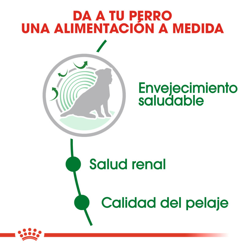 Mini Ageing 12+ de Royal Canin es un alimento adecuado para perros pequeños de más de 12 años y un peso de hasta 10 kg, y ha sido específicamente formulado teniendo en cuenta las necesidades nutricionales de los perros pequeños como el tuyo. Esta fórmula, especialmente desarrollada para favorecer el envejecimiento saludable de los perros de razas de tamaño pequeño, contiene ácidos grasos omega 3 muy beneficiosos, como los EPA y los DHA, así como un complejo exclusivo de antioxidantes que ayudan a neutralizar los efectos de los radicales libres. También ha sido desarrollado con un contenido de fósforo adaptado, lo que favorece el mantenimiento del funcionamiento saludable de los riñones de tu perro, a medida que envejece. Esta fórmula también favorece el mantenimiento de una buena condición de su piel y su pelo.