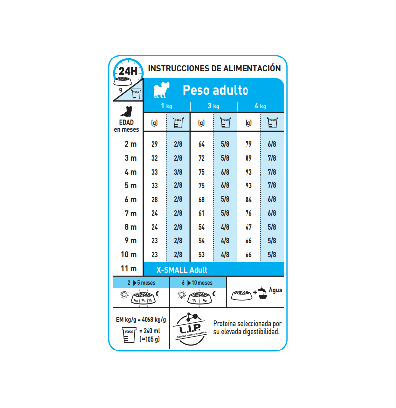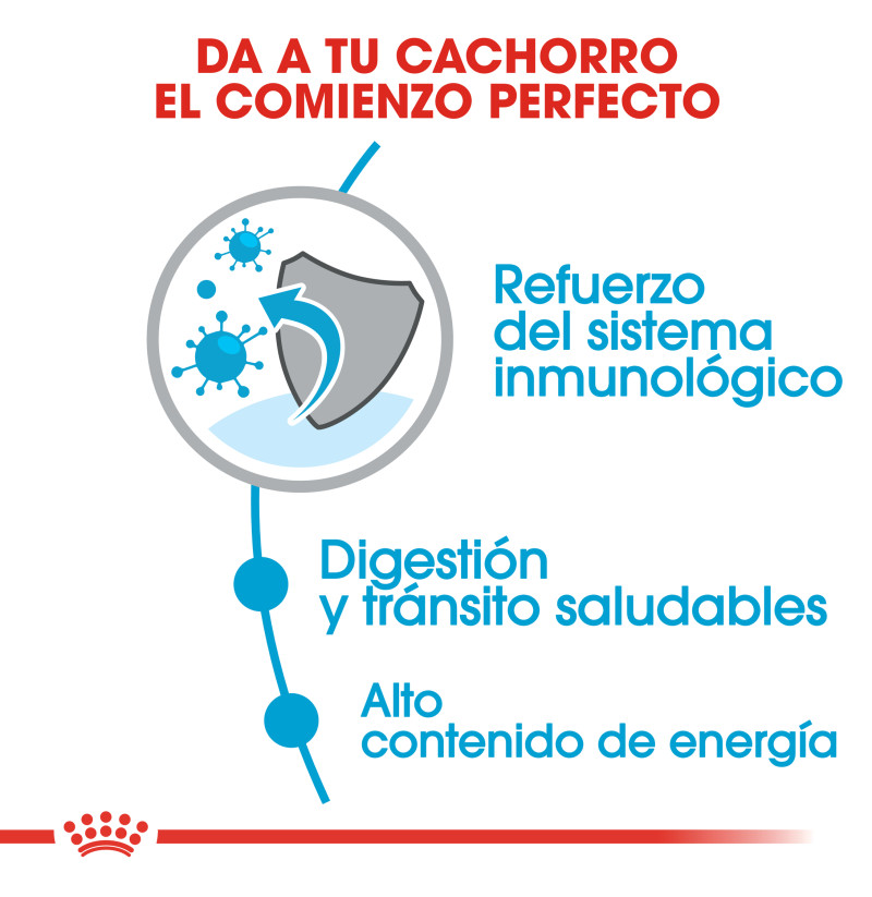 Royal Canin X-Small Puppy está especialmente formulado para satisfacer las necesidades nutricionales de los cachorros de razas muy pequeñas. Esta fórmula es adecuada para cachorros de 2 a 10 meses de edad, que alcanzarán un peso de adulto de hasta 4 kg. Este alimento a medida está enriquecido con un ácido graso omega-3 (DHA), que ha demostrado científicamente favorecer el desarrollo cerebral saludable de los cachorros. Gracias a una combinación de prebióticos beneficiosos (como FOS, MOS y la pulpa de remolacha) y proteínas de alta digestibilidad, también favorece el equilibrio saludable del microbioma (flora intestinal) y la salud digestiva. Esta fórmula contiene nutrientes como vitaminas C y E, que han demostrado favorecer las defensas naturales de los cachorros mientras su sistema inmunitario se está desarrollando. La fórmula también cuenta con un contenido energético óptimo, diseñado para satisfacer las elevadas necesidades energéticas de cachorros de razas muy pequeñas durante su rápido crecimiento. La croqueta también está especialmente adaptada para la mandíbula muy pequeña de tu cachorro, de modo que se pueda tomar y masticar con facilidad. Cuando tu cachorro la mastica, se produce un efecto de cepillado que ayuda a mantener su salud dental. A los 10 meses de edad, tu cachorro necesitará un alimento que esté especialmente adaptado para satisfacer sus necesidades nutricionales de perro adulto. En esta fase, puedes cambiar al alimento Royal Canin X-Small Adult.