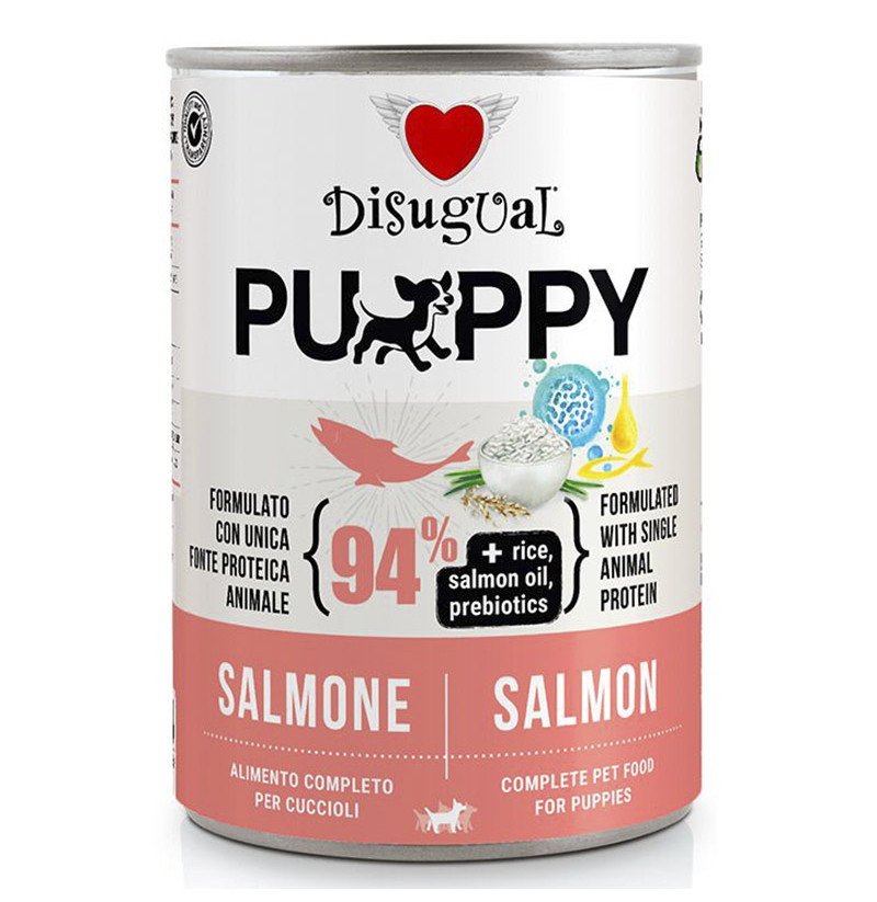 Disugual Puppy es un alimento completo de salmón para cachorros, formulado con una única fuente de proteína animal, apto para cachorros de todos los tamaños con un nivel normal de actividad física. El producto está formulado con un 94% de carne o pescado, adquiridos a proveedores seleccionados y garantizados, con la adición de prebióticos y antioxidantes, útiles para el funcionamiento intestinal.