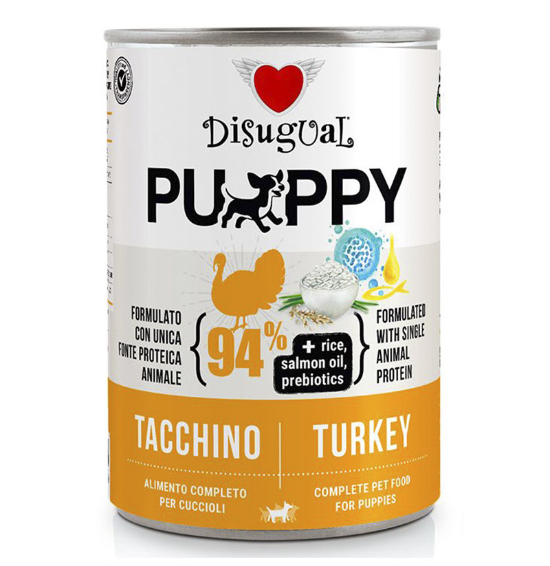Disugual Puppy es un alimento completo de pavo para cachorros, formulado con una única fuente de proteína animal, apto para cachorros de todos los tamaños con un nivel normal de actividad física. El producto está formulado con un 94% de carne o pescado, adquiridos a proveedores seleccionados y garantizados, con la adición de prebióticos y antioxidantes, útiles para el funcionamiento intestinal.