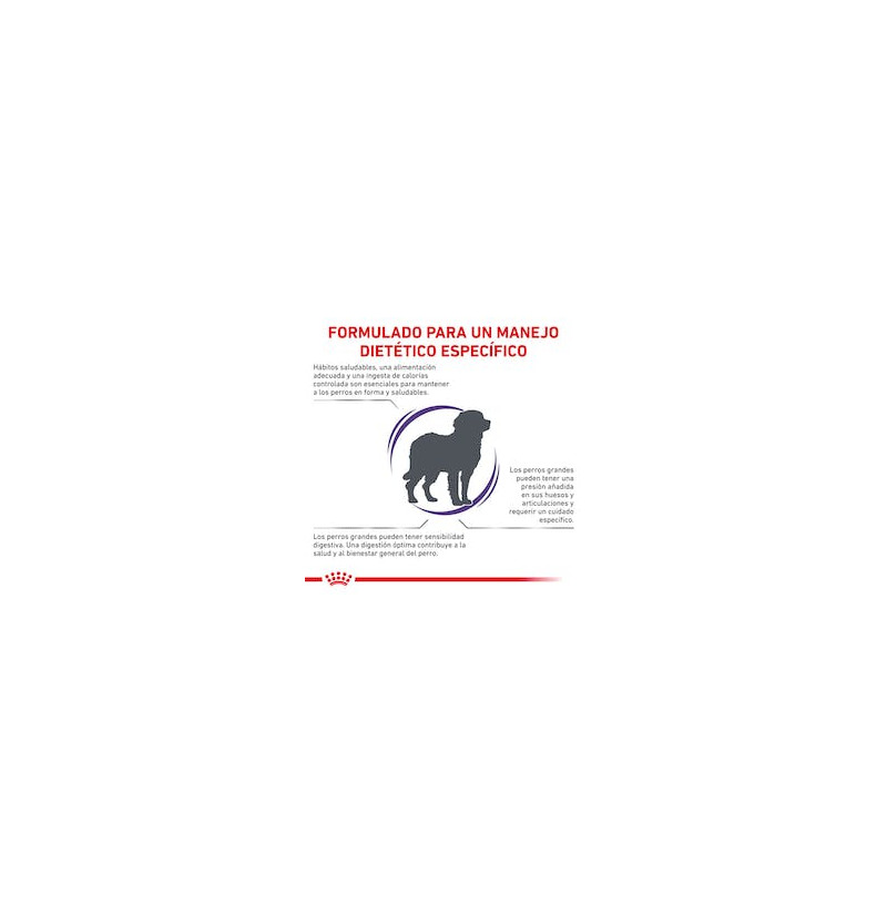 Royal Canin Adult Large está formulado especialmente para ayudar a mantener un peso óptimo y la salud general de los perros adultos de razas grandes. Este alimento está formulado con nutrientes de alta calidad para ayudar a mantener la salud de los huesos y las articulaciones de tu perro de tamaño grande. Esta fórmula de alta digestibilidad contiene prebióticos especialmente seleccionados para favorecer una digestión saludable. A demás, está enriquecido con una mezcla especial de antioxidantes para ayudar a neutralizar los efectos de los radicales libres y, en último término, contribuir a la salud de los tejidos y las células de tu perro. La transición de un alimento a otro debe realizarse de forma lenta y gradual durante un período de 7 a 10 días.
