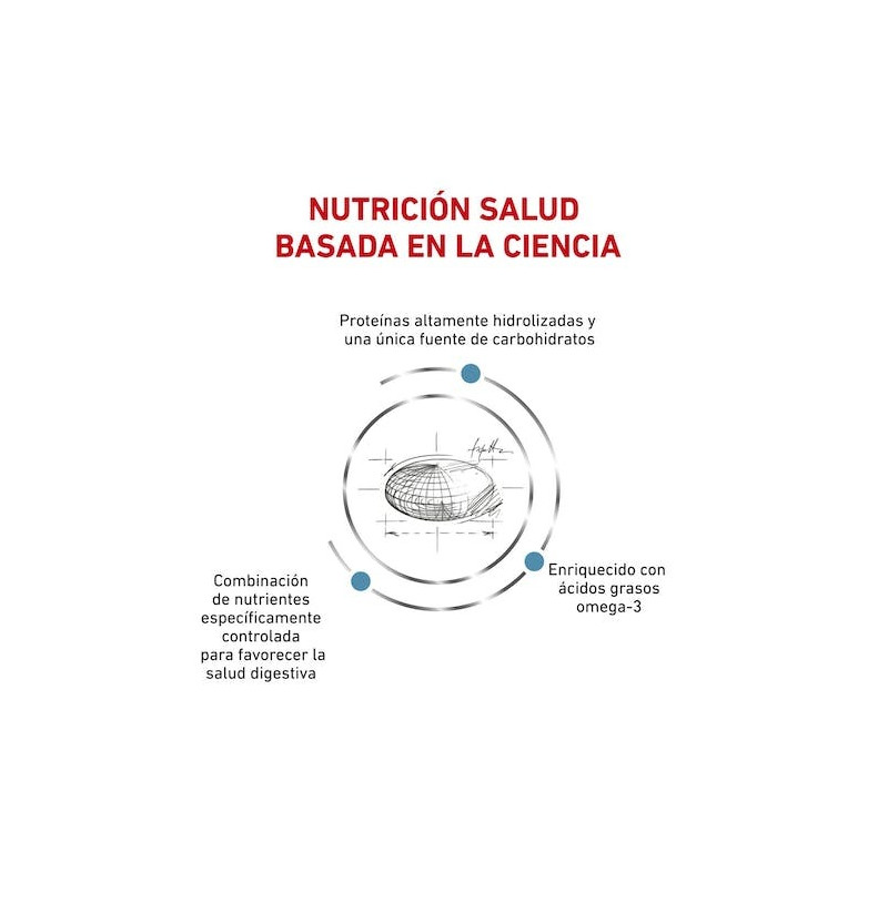 COMPOSICIÓN: arroz, hidrolizado de aislado proteico de soja, grasas animales, hígado de ave hidrolizado, pulpa de remolacha, minerales, aceite de soja, aceite de pescado, fructo-oligosacáridos, aceite de borraja, extracto de rosa de la India (fuente de luteína). Fuentes de proteína: hidrolizado de aislado proteico de soja, hígado de ave hidrolizado. Fuente de carbohidratos: arroz.