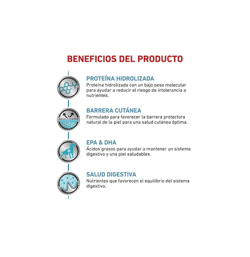 Royal Canin Hypoallergenic está formulado específicamente para ayudar a perros adultos con intolerancias y alergias alimentarias o sensibilidades dermatológicas. Esta fórmula contiene proteínas hidrolizadas con péptidos de pequeño tamaño para garantizar una dieta de alta digestibilidad y baja alergenicidad, que favorece una mejor absorción de proteínas y reduce el riesgo de reacción alérgica. Gracias a su combinación de nutrientes de apoyo, esta fórmula también favorece la barrera protectora natural de la piel de tu perro. Esta dieta contiene EPA y DHA, unos ácidos grasos que favorecen y ayudan mantener la salud de la piel y el sistema digestivo de tu perro. También incluye nutrientes adicionales que contribuyen a un buen equilibrio intestinal para una salud digestiva óptima.