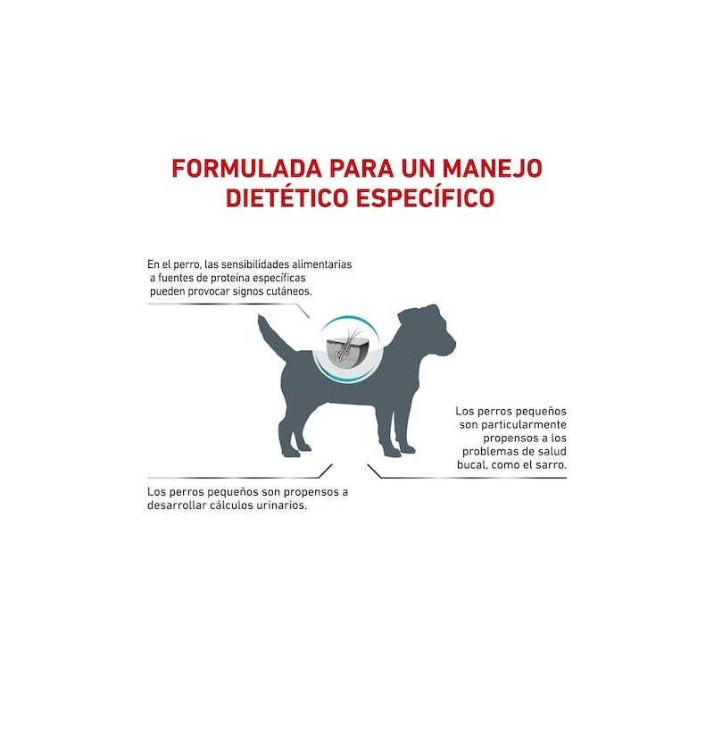 Royal Canin Hypoallergenic Small Dogs está formulado específicamente para ayudar a perros de razas pequeñas con intolerancias y alergias alimentarias o sensibilidades dermatológicas. Esta fórmula contiene proteínas hidrolizadas con un peso molecular bajo para garantizar una dieta de alta digestibilidad y baja alergenicidad, que favorece una mejor absorción de proteínas y reduce el riesgo de reacción alérgica. Esta dieta ayuda a disminuir la concentración de iones que pueden favorecer la formación de cristales en el tracto urinario, demostrado a través de una baja SSR (supersaturación relativa) obtenida en estudios. Formulado para favorecer la barrera protectora natural de la piel para ayudar a mantener una salud cutánea óptima. Esta fórmula contiene nutrientes específicos que ayudan a proteger y mantener la salud oral de tu perro.