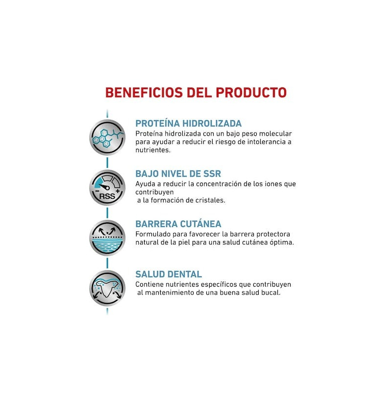 COMPOSICIÓN: arroz, hidrolizado de aislado proteico de soja, grasas animales, minerales, hígado de ave hidrolizado, aceite de soja, pulpa de remolacha, aceite de pescado, fructo-oligosacáridos, aceite de borraja, extracto de rosa de la India (fuente de luteína). Fuentes de proteína: hidrolizado de aislado proteico de soja, hígado de ave hidrolizado. Fuente de carbohidratos: arroz.