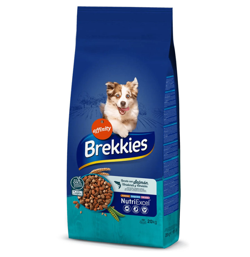 Brekkies NutriExcel con salmón, verduras y cereales ofrece una nutrición equilibrada y un excelente sabor para perros adultos. Sus nuevas recetas sin colorantes artificiales, ni conservantes están cocidas al vapor.