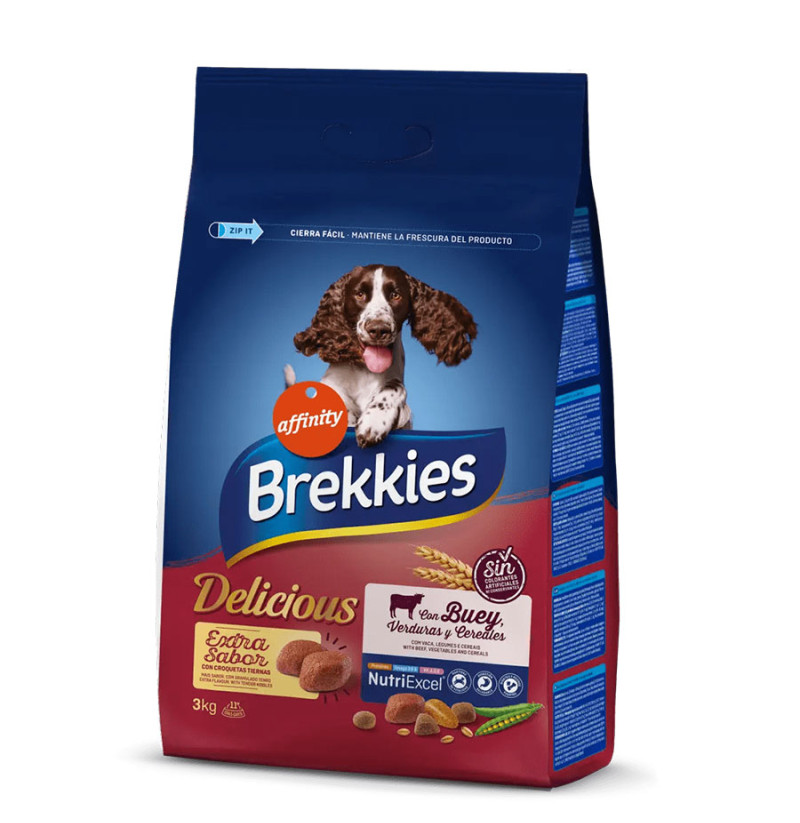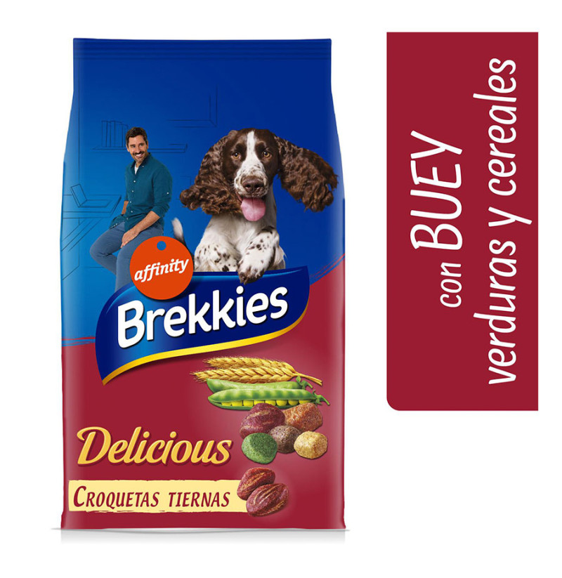 Extra Sabor. Con Croquetas tiernas. Brekkies Delicious con Buey, Verduras y Cereales es un irresistible alimento completo y equilibrado que sorprende por sus croquetas tiernas, que harán de la comida diaria de tu perro un auténtico placer.
