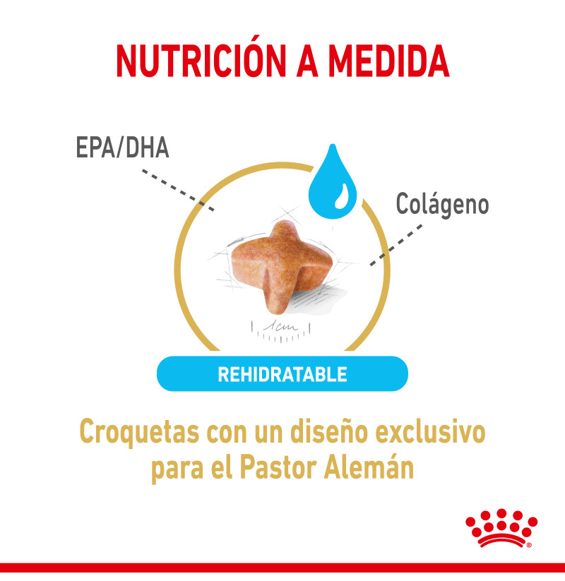 German Shepherd Adult 5+ de Royal Canin es un alimento a medida, específico para el Pastor Alemán adulto de más de 5 años de edad. Su fórmula contiene una combinación sinérgica de antioxidantes para ayudar a mantener la salud celular y renal de tu perro durante el proceso de envejecimiento. Está formulado específicamente para proporcionar nutrientes avanzados y así ayudar a mantener unos huesos y articulaciones saludables. Contiene proteínas altamente digestibles y una selección específica de fibras solubles e insolubles para ayudar a mantener una digestión saludable y favorecer una calidad óptima de las heces. A demás, se caracteriza por sus croquetas a medida, con una forma, tamaño y textura adecuados para adaptarse a la forma de la mandíbula y a los hábitos alimentarios de la raza Pastor Alemán.