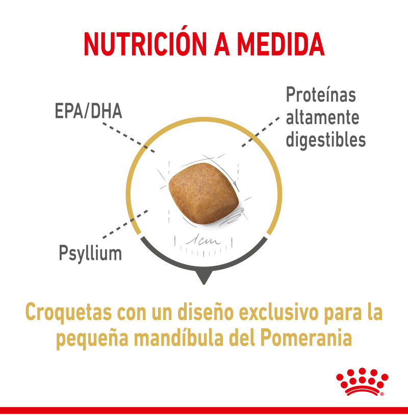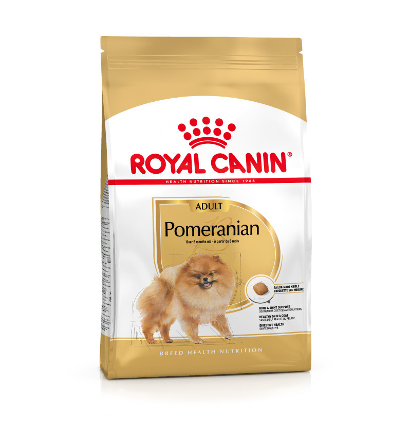 Royal Canin Pomeranian Adult es un alimento a medida para perros de raza formulado específicamente para el Pomerania adulto como el tuyo. Contiene nutrientes avanzados y un contenido de minerales adaptado para ayudar a mantener las articulaciones y los huesos saludables. Esta fórmula ayuda a mantener la función natural de barrera protectora de la piel de tu perro al mismo tiempo que nutre el magnífico pelaje del Pomerania. Esta fórmula utiliza proteínas de alta calidad y altamente digestibles para favorecer una digestión eficiente. La combinación equilibrada de fibras favorece un tránsito saludable y promueve una calidad óptima de las heces. A demás, se caracteriza por unas croquetas a medida con una forma, tamaño y textura adaptados y una densidad específica para adaptarse a la forma y el tamaño de la mandíbula del Pomerania para estimular el apetito de cada perro.