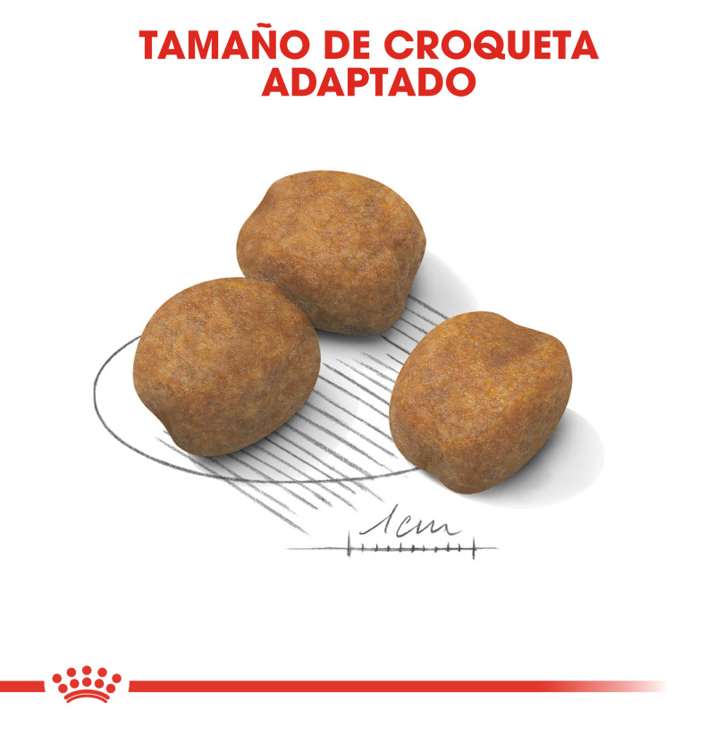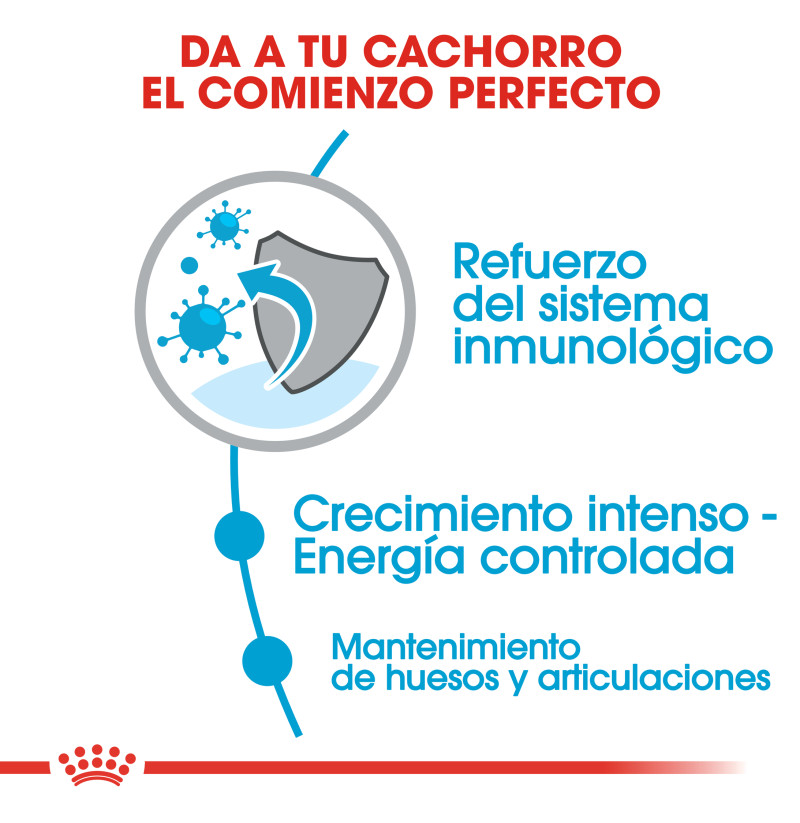 Royal Canin Giant Puppy está especialmente formulado para satisfacer las necesidades nutricionales de los cachorros de razas gigantes. Esta fórmula es adecuada para cachorros de 2 a 8 meses de edad, que alcanzarán un peso de adulto de más de 45 kg. Este alimento a medida contiene nutrientes adecuados para favorecer el período de crecimiento intenso de tu cachorro de raza gigante, entre los 2 y los 8 meses, y ayuda a prevenir el aumento de peso. También contiene nutrientes como vitaminas C y E, que han demostrado contribuir al desarrollo saludable del sistema inmunitario de los cachorros. Los perros muy grandes tienen un sistema digestivo sensible. Una combinación de prebióticos beneficiosos (como FOS, MOS y pulpa de remolacha) y proteínas de alta digestibilidad favorece el equilibrio saludable del microbioma (flora intestinal) y la salud digestiva. Además, la fórmula contiene niveles adecuados de minerales, incluyendo calcio y fósforo, para favorecer el desarrollo de huesos fuertes y de rápido crecimiento. La croqueta también está especialmente adaptada para la mandíbula extra grande de tu cachorro, de modo que se pueda coger y masticar con facilidad.