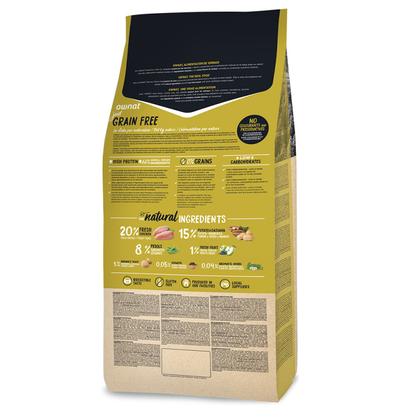 Pollo fresco* (mín. 20% antes de la extrusión), pollo deshidratado (16%), cerdo deshidratado (14%), guisantes enteros* (8%), patata deshidratada* (8%), grasa avícola (preservada con antioxidantes naturales), raíces de mandioca* (7%), salmón deshidratado (6%), proteína hidrolizada de pollo, levadura de cerveza* (1%), pulpa de remolacha, manzana* (1%), aceite de pescado (preservado con antioxidantes naturales), sal gema*, fructo y manano oligosacáridos, alfalfa deshidratada*, algas marinas deshidratadas* (500 mg/kg), glucosamina (500 mg/kg), yucca schidigera, condroitín sulfato (100 mg/kg), arándanos* (100 mg/kg), tomillo* (80 mg/kg), flor de manzanilla* (80 mg/kg), hinojo* (80 mg/kg), equinácea* (80 mg/kg), té verde* (80 mg/kg).*Ingredientes naturales