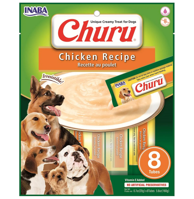 Estas golosinas cremosas para perros están hechas con pollo de granja 100% puro y natural. Disponible en cinco deliciosas variedades, los purés Churu® tienen un alto contenido de humedad que los caninos necesitan para su salud. Simplemente abra un tubo y apriételo un poco para alimentar a mano estas golosinas sin cereales ni conservantes. También puede verterlos en un tazón o usarlos como una cubierta sabrosa en alimentos húmedos o secos.