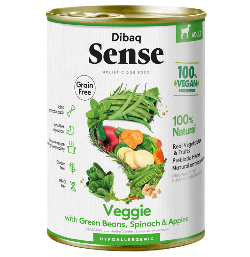 Dibaq Sense Veggie es una latita hipoalergénica elaborada con frutas y verduras frescas. Perfecta para complementar la dieta Barf o darles un extra de fibra.