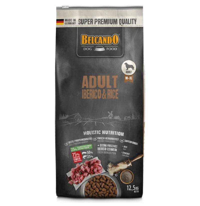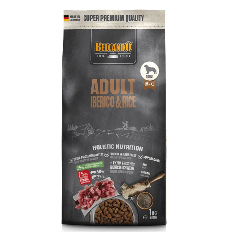 carne, hígado, bazo y riñon fresco de cerdo ibérico (30 %); arroz (29 %); proteínas de cerdo ibérico, secado (12,5 %); harina de pescado de agua salada (9 %); harina forrajera de avena; harina de guisantes; levadura de cerveza secada; vainas de algarroba, secas; harina de habas (Vicia faba); semilla de uva prensada por expulsor; semillas de chía (1,5 %); aceite de salmón (1,5 %); levaduras, hidrolizado; semillas de lino; aceite de cardo (1 %); fosfato dicálcico; cloruro de sodio; cloruro de potasio; hierbas, secadas (total: 0,2 %; hojas de ortiga, raíz de genciana, centaura menor, manzanilla, hinojo, alcaravea, muérdago, aquilea, hojas de zarzamora); yucca schidigera