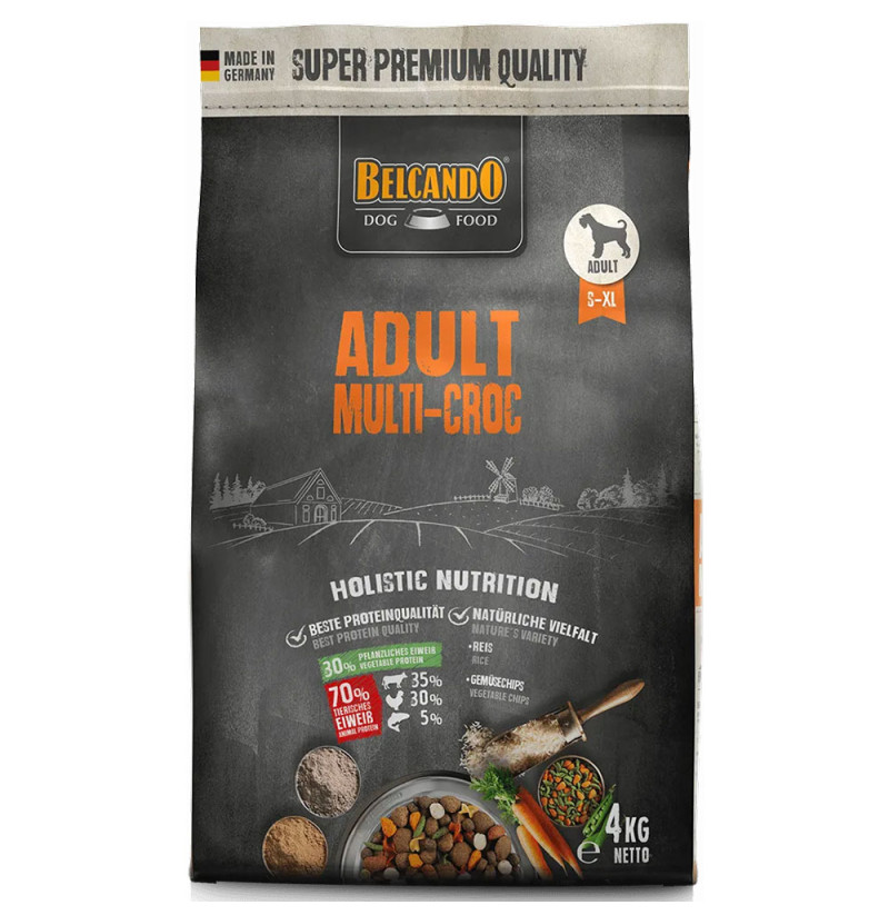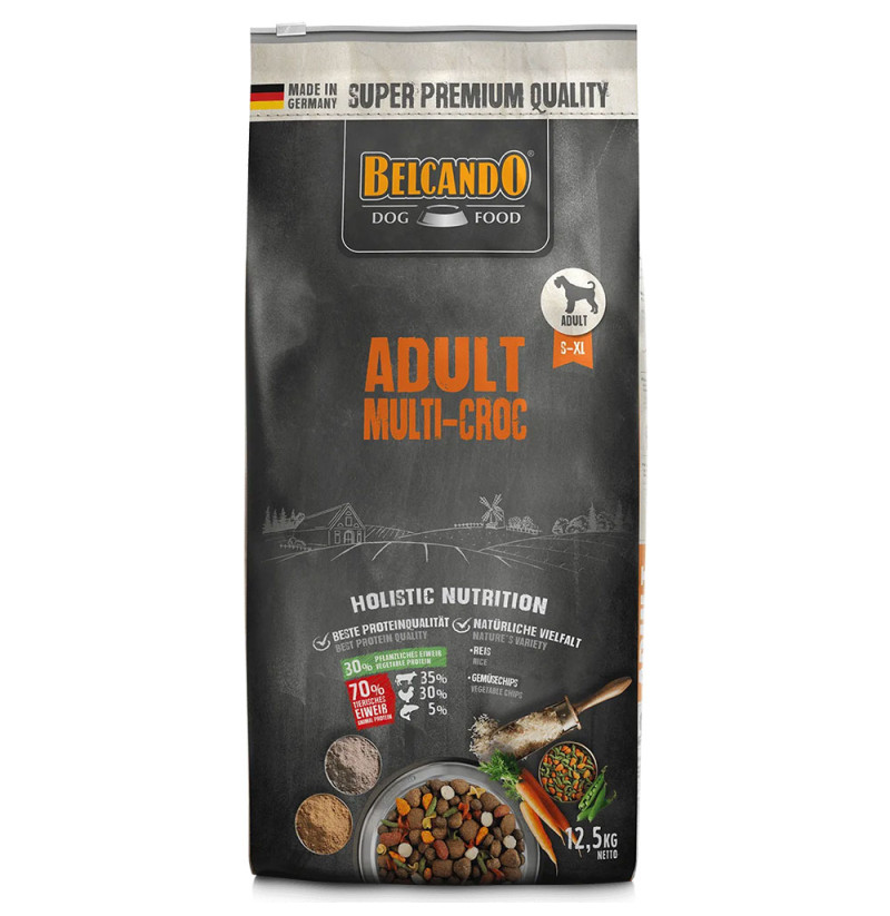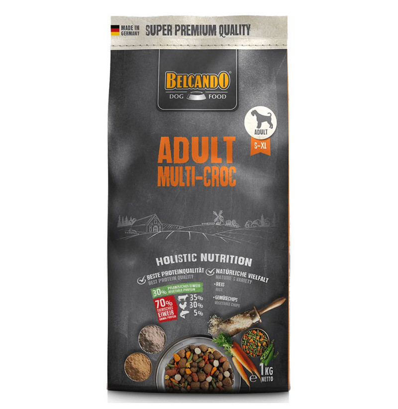 Unas excelentes materias primas y mucho arroz como carbohidrato de digestión extremadamente fácil hacen que BELCANDO® Adult Multi-Croc se tolere muy bien. La sabrosa combinación de diferentes croquetas, trocitos de verduras y pasta es ideal para perros adultos a los que les guste la variedad.