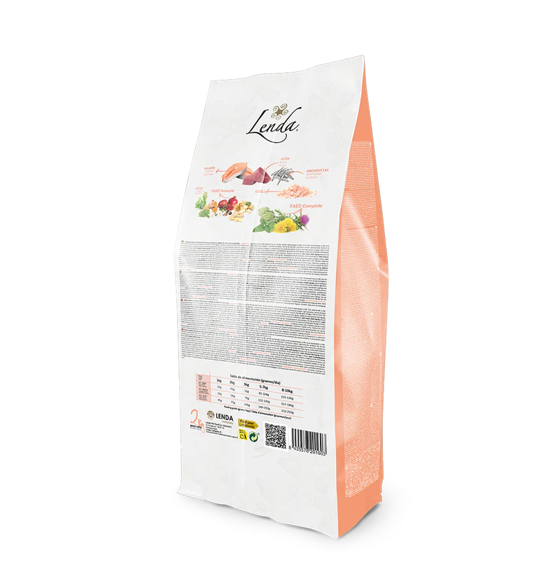 Pescado azul 29,5% (Salmón fresco* 33,9%, Salmón deshidratado 33,9%, Anchoveta deshidratada 11,9%, Atún deshidratado 11,8% hidrolizado de pescado azul 8,5%), Arroz integral*, Boniato*, aceite de Pollo filtrado 9%, proteína plasmática 5%, Lentejas*, almidón de Patata, harina de Garrofa* (Ceratonia siliqua), lignocelulosa, levadura de Cerveza (Saccharomyces cerevisiae, fuente de mananoligosacáridos MOS), Krill deshidratado (Euphasia superba, fuente de ácidos grasos Omega-3 y astaxantina) 2%, aceite de Salmón (fuente de ácidos grasos Omega 3 EPA y DHA) 2%, sustancias minerales, FAEC Complete 10000 mg/Kg (extracto de Yucca schidigera, extracto de levadura (Saccharomyces cerevisiae, como fuente de MOS y Nucleótidos), glucosamina 500 mg/Kg, sulfato de condroitina 500 mg/Kg, metilsulfonilmetano 250 mg/Kg, raíz de Achicoria, Salvia rosmarinus, Melissa officinalis, Taraxacum officinale, Salvia officinalis, Minthostachys verticillata, Cynara scolymus, Silybum marianum), FAEC Joints 3000 mg/Kg (levadura de cerveza (Saccharomyces cerevisiae), harina de Garrofa* (Ceratonia siliqua), sulfato de condroitina 600 mg/Kg, glucosamina 600 mg/Kg, metilsulfonilmetano 450 mg/Kg, Harpagophytum procumbens, Punica granatum), FAEC Inmune 500 mg/Kg (Panax ginseng, Punica granatum, Zingiber officinale, Urtica dioica, Camellia sinensis, Curcuma longa, Harpagophytum procumbens, aceite de microalga Schizochytrium sp. (fuente de ácidos grasos Omega 3 DHA)), FAEC ProbioDigestive (Enterococcus faecium, Lactobacillus plantarum, Lactobacillus acidophilus, Lactobacillus rhamnosus).-*Materias primas naturales.