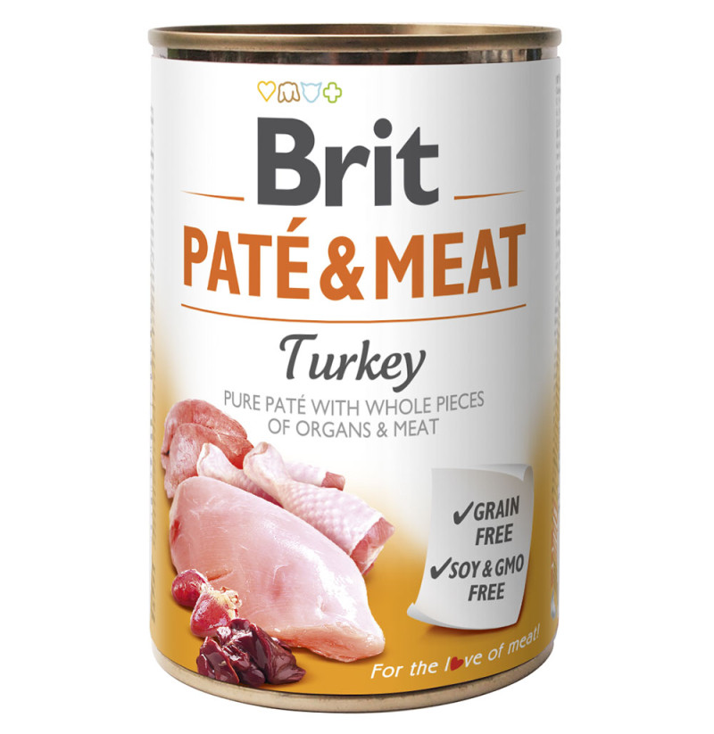 Brit PATE & MEAT lata de pavo y paté es un alimento Súperpremium para perros. Para caninos verdaderamente gourmets. Pedacitos de carne cuidadosamente seleccionados con un sabor único bañados en una salsa vegetal suave y paté. Amplia selección de sabores como complemento alimenticio para todos los días.