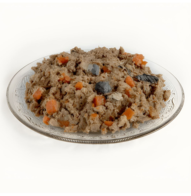 Comida húmeda para perros de pescado fresco con zanahorias. Receta equilibrada en proteínas, grasas y fibras, elaborada con ingredientes naturales. Sin Cereales