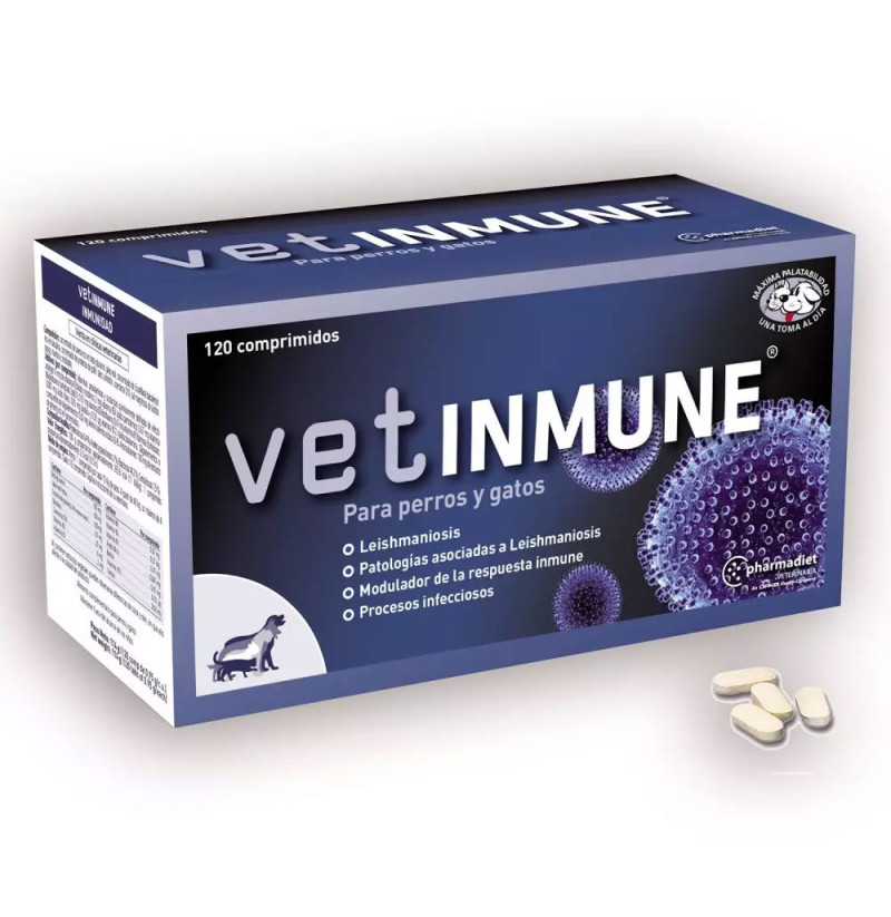https://tienda.todomascota.es/perros/28828-vetinmune-inmunidad-para-perros-y-gatos-8437002582869.html#/cantidad-120_comprimidos MVT01117 VETINMUNE Inmunidad para perros y gatos <h2>PHARMADIET VETINMUNE 120 Comprimidos Inmunidad para Perros y Gatos</h2> <p>Ayuda a mejorar la respuesta inmune del organismo frente a posibles infecciones.</p> <p></p> <p><strong>Producto indicado para:</strong></p> <p>- <strong>Leishmaniosis</strong> y patologías asociadas.</p> <p>- Cachorros con <strong>sistema inmune débil</strong>.</p> <p>- Tratamiento y post-tratamiento nutricional en<strong> infecciones crónicas persistentes</strong>.</p> <p>- Estimulante del apetito.</p> <p></p> <p><strong>Perros:</strong> 1 comprimido por cada 10 Kg. de peso.</p> <p>A partir de 40 Kg: un máximo de 4 comprimidos.</p> <p><strong>Gatos:</strong> 1/2 comprimido.</p> <p></p> <p><strong>Principio Activo:</strong><br />BETA GLUCANOS, JALEA REAL, EXTRACTO GINSENG, BAICALINA,COENZIMA Q10, VITAMINAS</p> https://tienda.todomascota.es/59951-large_default/vetinmune-inmunidad-para-perros-y-gatos.jpg 43.95 instock PHARMADIET 43.95 39.9545 0 02024-01-03T16:33:28+0100/Gatos /Perros /Perros/Complementos alimentarios y vitamínicos para perros /Gatos/Complementos alimentarios y vitamínicos para gatos