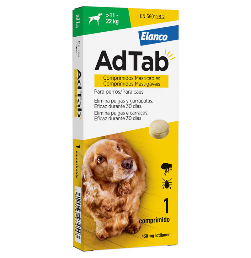AdTab para perros elimina pulgas y garrapatas de manera inmediata y persistente durante 1 mes (se administra cada 30 días).