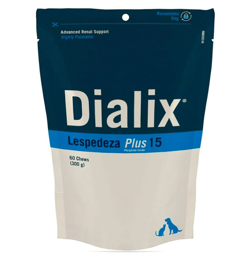 VETNOVADialix Lespedeza Plus 15 es un Suplemento Formulado en Chews de Alta Palatabilidad, rico en Flavonoides, que Ayudan a Mantener la Función Renal, y Carbonato de Calcio, que actúa como Quelante de Fosfato.