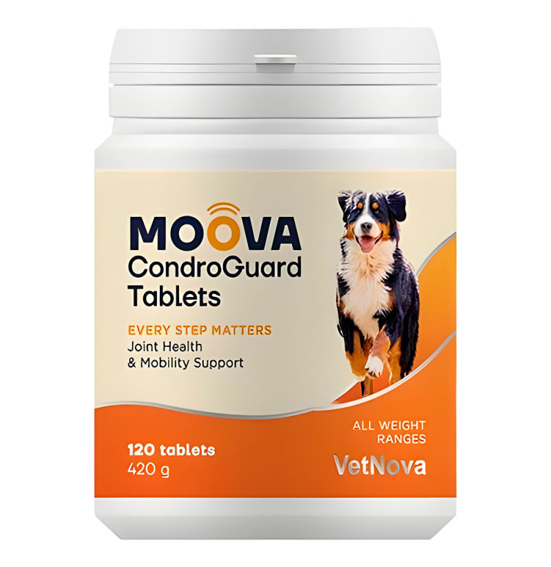 Vetnova Moova Condroguard Tablets (comprimidos) es un suplemento condroprotector para perros. Alimento Complementario Formulado en Chews y en Comprimidos de Alta Palatabilidad con Glucosamina, Condroitín sulfato, Harpagofito y Antioxidantes. Indicado para Ayudar a Mantener una Óptima Movilidad y Calidad de Vida en perros.