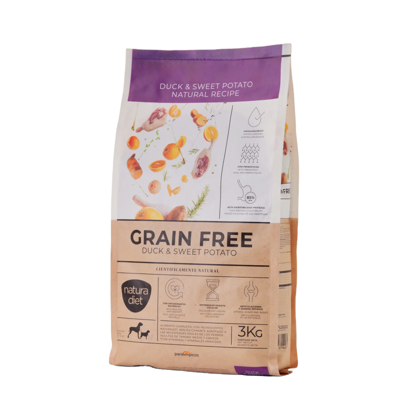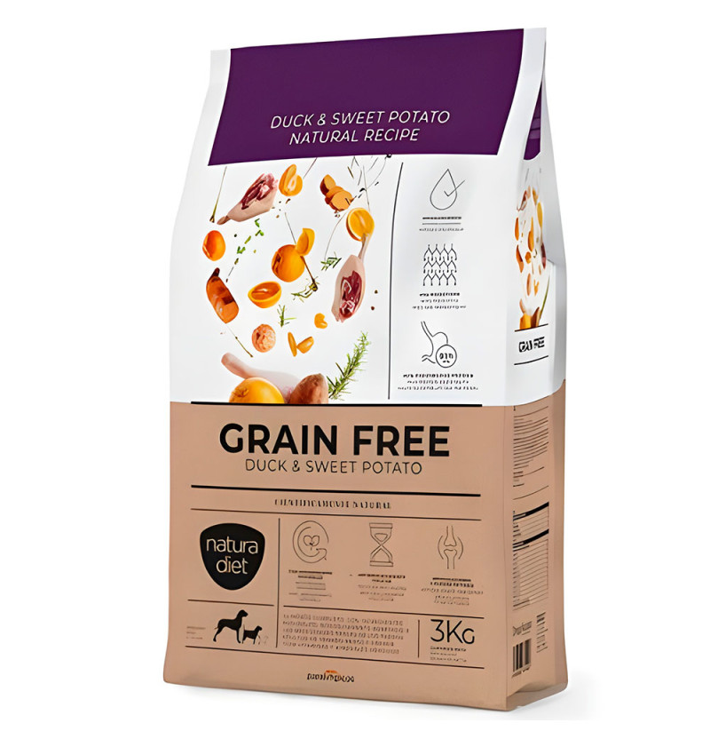 NATURA DIET DOG Grain Free Duck & Sweet Potato es un alimento seco de alta calidad, especialmente formulado para perros adultos de raza media y grande, que destaca por su receta sin cereales, ideal para animales con sensibilidades alimentarias o intolerancias al gluten. Su principal fuente de proteína animal es el pato, una carne de alta digestibilidad y sabor único que, combinada con batata (sweet potato), proporciona una excelente fuente de energía y fibra.