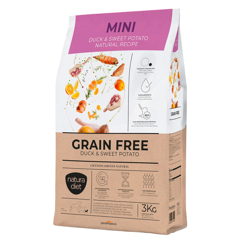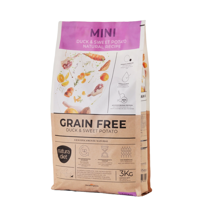 NATURA DIET DOG Grain Free Mini Duck & Sweet Potato es un alimento seco de alta calidad, especialmente formulado para perros adultos de raza mini o pequeña, que destaca por su receta sin cereales, ideal para animales con sensibilidades alimentarias o intolerancias al gluten. Su principal fuente de proteína animal es el pato, una carne de alta digestibilidad y sabor único que, combinada con batata (sweet potato), proporciona una excelente fuente de energía y fibra.