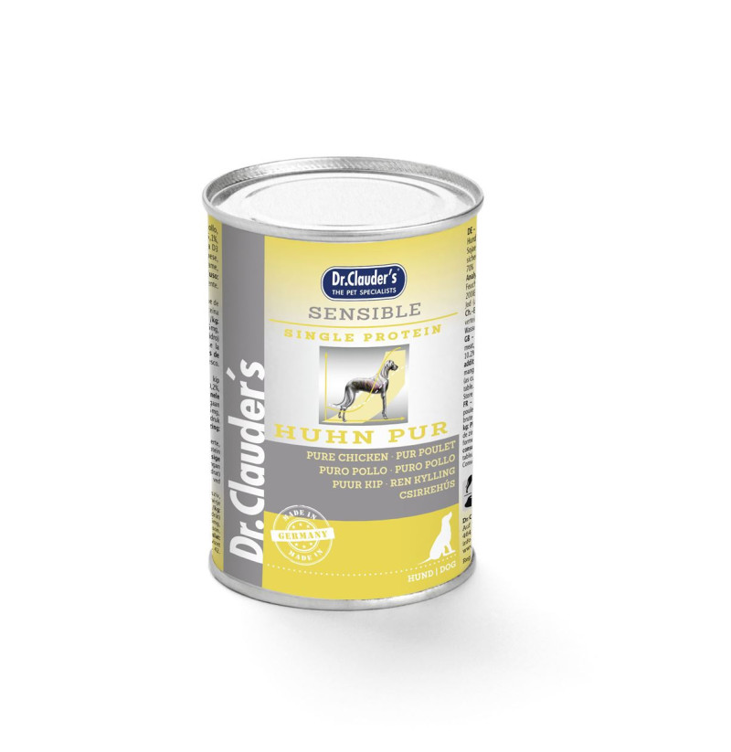 https://tienda.todomascota.es/perros/29489-dr-clauder-lata-sensitive-puro-pollo-para-perros-4014355226806.html#/cantidad-400gDR22268000Dr. Clauder Lata Sensitive Puro Pollo para perros<p>La <strong>Lata Dr. Clauder Sensitive Puro Pollo</strong> es un alimento húmedo de alta calidad, diseñado especialmente para perros con sensibilidades alimentarias, alergias o necesidades nutricionales específicas. Este producto ofrece una solución natural, saludable y deliciosa para complementar o formar parte de la dieta diaria de tu perro.</p> <h3>Características:</h3> <ul> <li><strong>Ingredientes principales</strong>: <ul> <li>100% carne de pollo, sin mezclas de otras fuentes de proteínas animales, ideal para dietas de exclusión.</li> </ul> </li> <li><strong>Hipoalergénica</strong>: Especialmente formulada para perros con alergias o intolerancias alimentarias.</li> <li><strong>Natural y saludable</strong>: Sin conservantes, colorantes ni saborizantes artificiales.</li> <li><strong>Fácil digestión</strong>: Su fórmula es suave para el sistema digestivo y adecuada para perros con estómagos sensibles.</li> <li><strong>Rico en proteínas</strong>: El pollo aporta proteínas de alta calidad que favorecen la salud muscular.</li> </ul> <h3>Beneficios:</h3> <ul> <li>Ideal para perros con problemas digestivos o alergias a otras fuentes de proteínas.</li> <li>Aporta una dieta equilibrada con un enfoque en ingredientes naturales y saludables.</li> <li>Su textura húmeda y sabor natural la hacen atractiva incluso para los perros más selectivos.</li> <li>Perfecta para complementar una dieta de exclusión o como alimento completo en casos de sensibilidad alimentaria.</li> </ul>https://tienda.todomascota.es/60952-large_default/dr-clauder-lata-sensitive-puro-pollo-para-perros.jpg3.7818instockDR. CLAUDER'S4.2023.438100.3822025-01-10T10:28:54+0100/Perros/Perros/Alimentación para perros/Perros/Alimentación para perros/Comida para perros húmeda/Perros/Alimentación para perros/DR. CLAUDER'S perros/Perros/Alimentación para perros/Dietas/Perros/Alimentación para perros/Dietas/Dieta Estómagos Sensibles