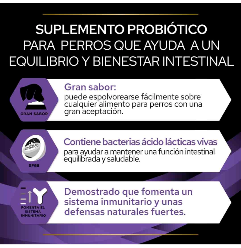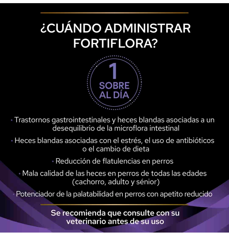 FortiFlora de Purina Pro Plan Veterinary Diets es un suplemento dietético probiótico en sobres de 1 g, ideal para perros y cachorros. Cada sobre contiene un nivel garantizado de bacterias vivas de la cepa Enterococcus faecium SF68® (mínimo 5 × 10⁸ UFC/g) en forma microencapsulada, lo que garantiza su estabilidad y eficacia al llegar al tracto digestivo.