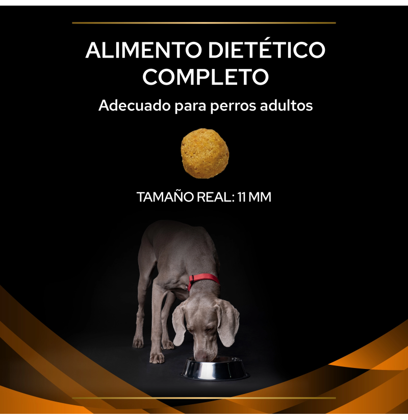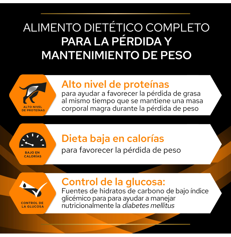 Alimento dietético completo para perros adultos, formulado para la reducción del exceso de peso corporal y el control de la glucosa en casos de diabetes mellitus. Ofrece un alto nivel de proteínas para conservar la masa muscular durante la pérdida de grasa, una dieta baja en calorías y carbohidratos de <strong=bajo índice glucémico para ayudar en el manejo nutricional de la diabetes mellitus.