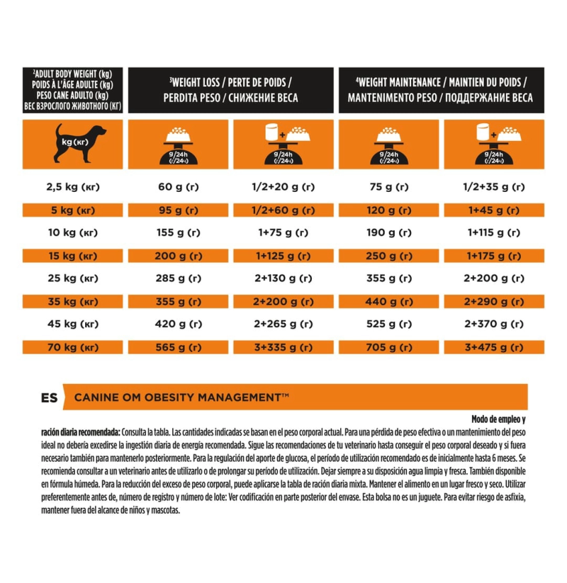 Recomendado para perros con obesidad o sobrepeso, perros diabéticos con exceso de peso, y en enfermedades sensibles a la fibra como estreñimiento, hiperlipidemia o colitis fibrosa. No debe usarse en perros en crecimiento, hembras gestantes o lactantes ni en estados catabólicos avanzados. Uso inicial de hasta 6 meses bajo supervisión veterinaria, con agua fresca siempre disponible. Puede emplearse como dieta de mantenimiento a largo plazo tras perder peso.